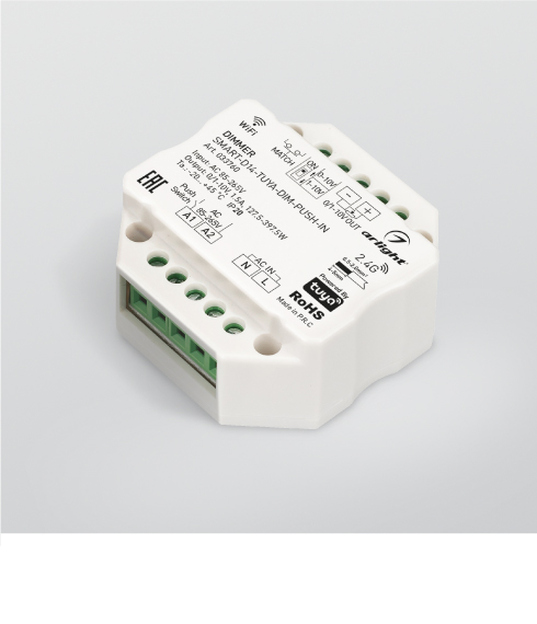 Удобная установка Сетевое напряжение AC 230 В и компактный корпус из ПВХ позволяют устанавливать диммеры в стандартный подрозетник.