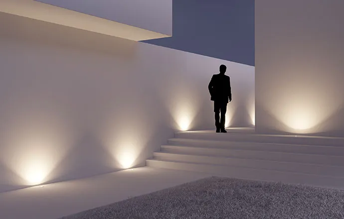 Смена акцентов Угол наклона светового луча 30° позволяет направлять свет на стену здания, установив светильник в грунт или отмостку.