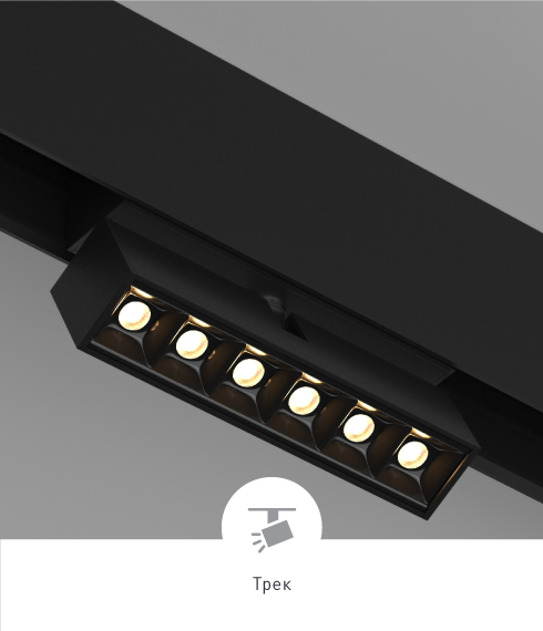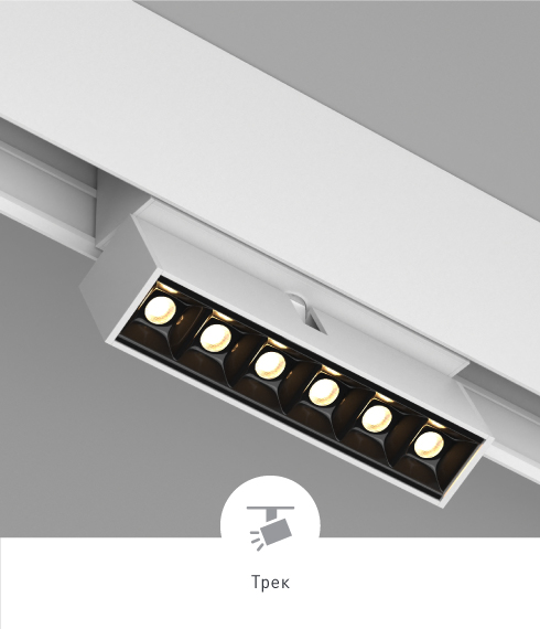 Возможно диммирования. Быстрая установка в шинопровод с помощью магнитов. Светильник можно легко перемещать вдоль трека, меняя направление светового потока.