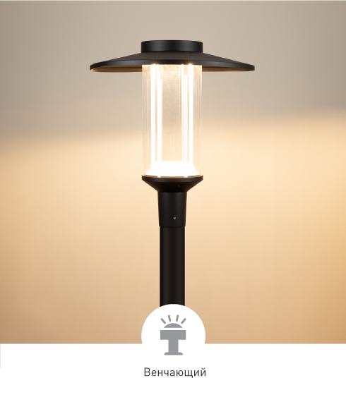 Материалы конструкции Алюминиевый корпус в черном цвете, стеклянный плафон, напоминающий аутентичные парковые светильники.