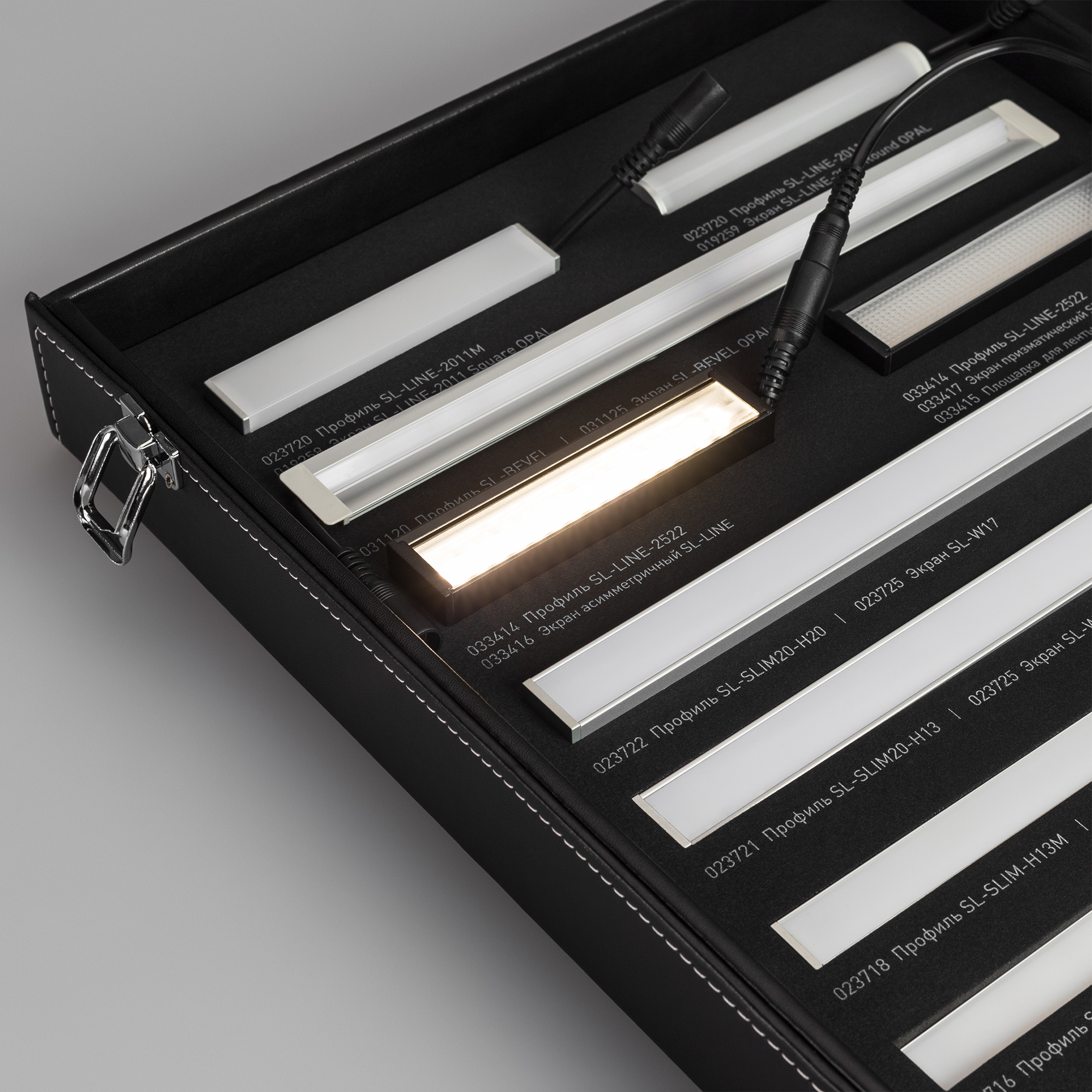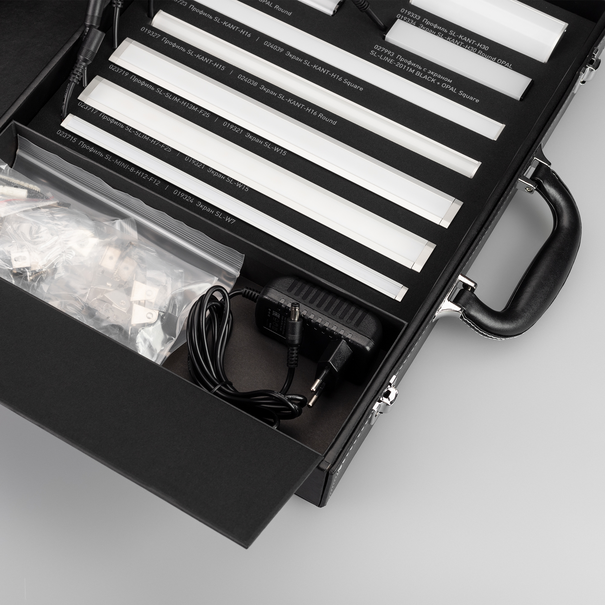 Демонстрационный набор образцов профиля SL-LINE-2011, SL-KANT-H16/H30, SL-SLIM/SLIM20, SL-MINI-8 в комплекте с экранами, светодиодной лентой напряжением 24В и заглушками. В комплекте идет блок питания для демонстрационного подключения.