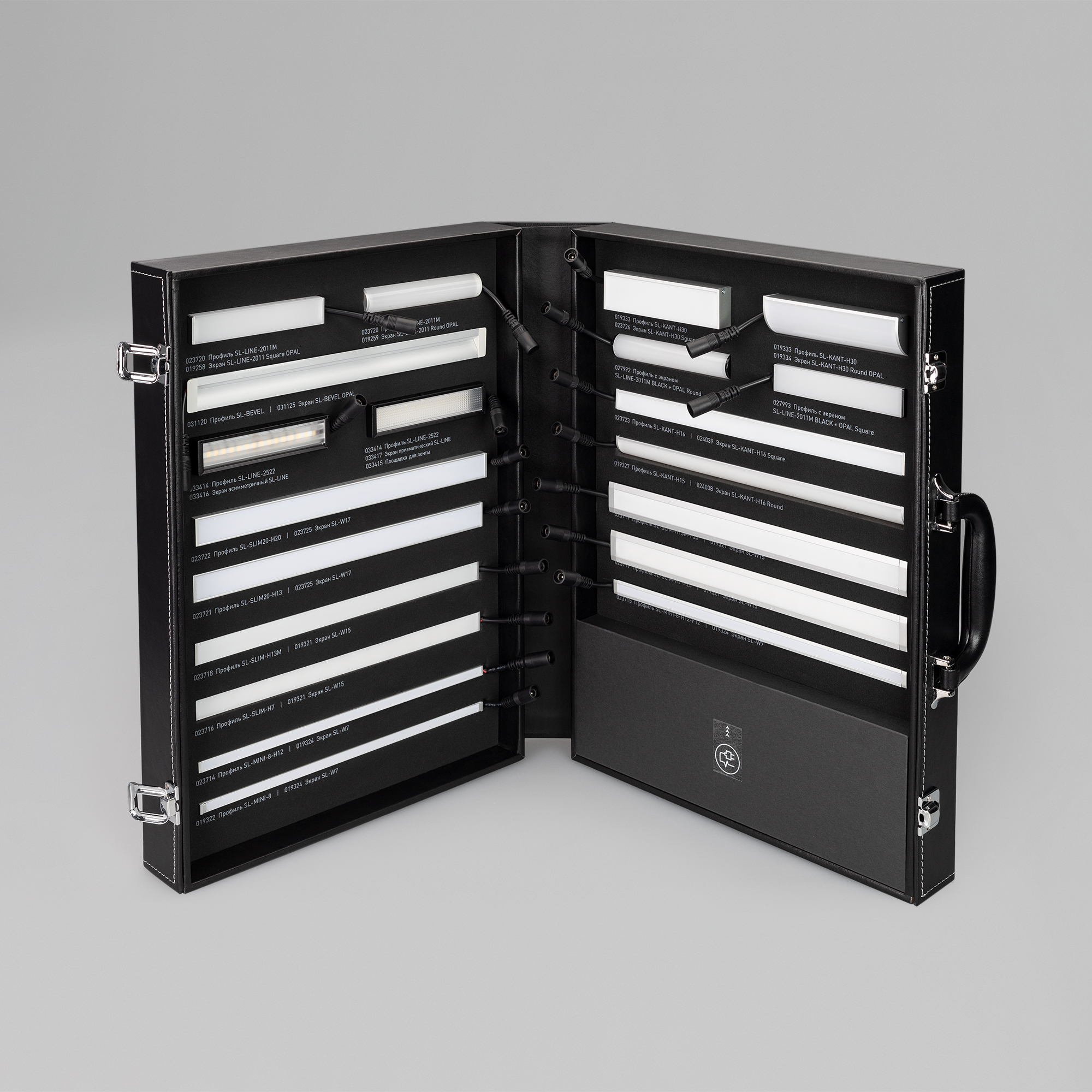 Демонстрационный набор обновлённых профилей серий SL-LINE-2011, SL-KANT-H16/H30, SL-SLIM/SLIM20, SL-MINI-8. Включает отрезки профиля с экраном и заглушками по 20см со светодиодной лентой 24В. Также в комплекте блок питания.