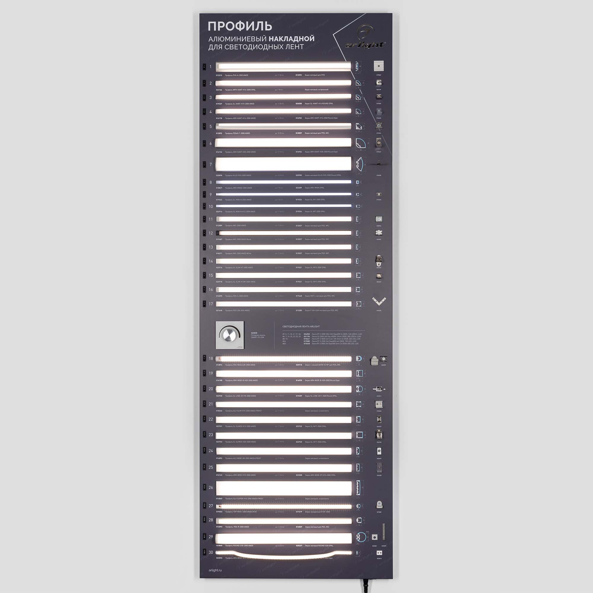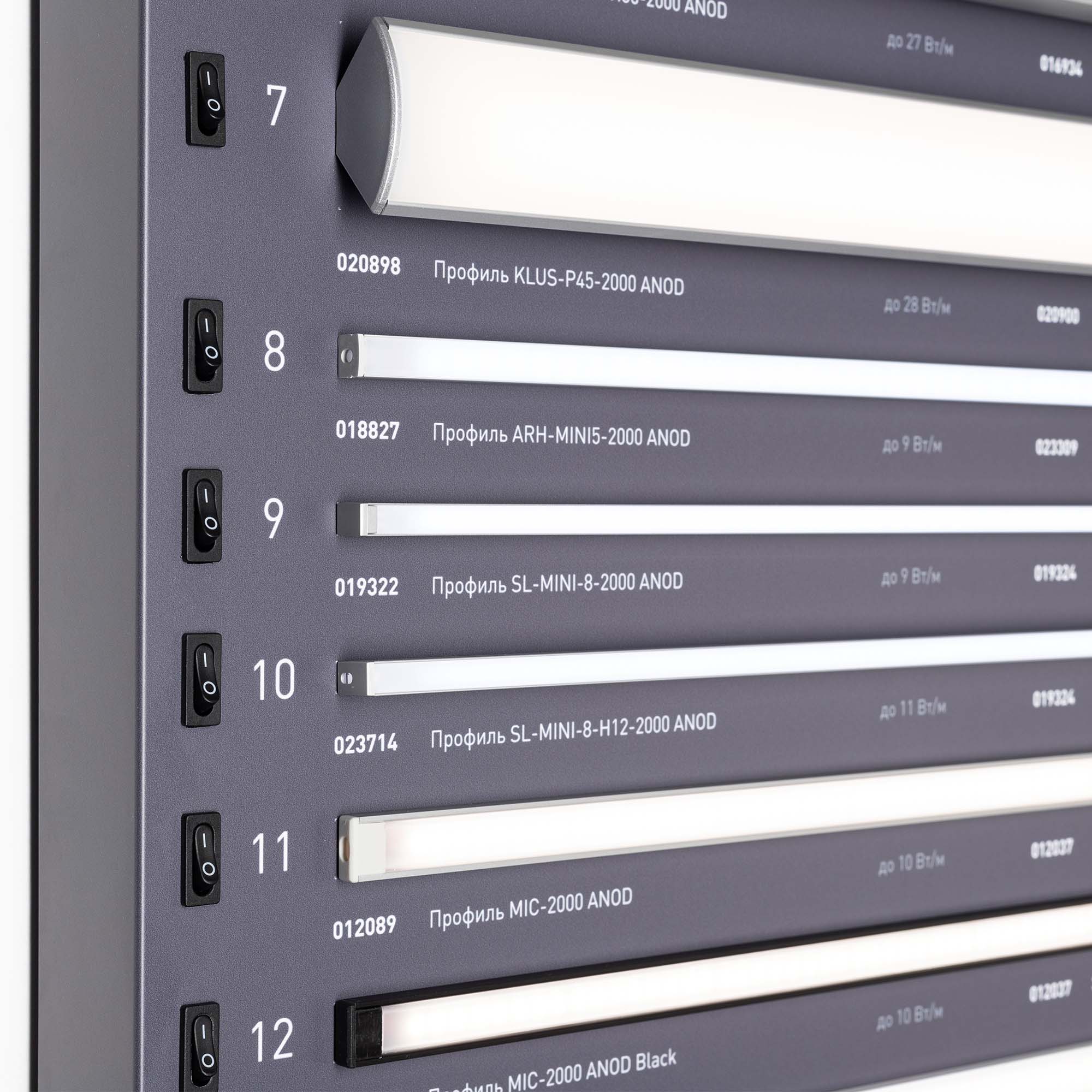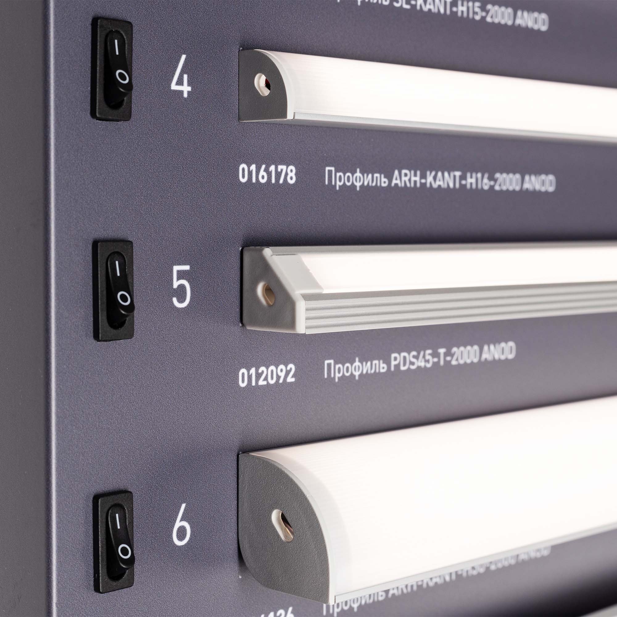 Стенд Алюминиевые Профили Накладные со светодиодной лентой. 30 моделей профилей. Материал - композит 3 мм, пленка, печать. Габаритные размеры (Ширина Х Высота Х Глубина), 600х1760х60 мм. Питание 230 В. Мощность 170 Вт.