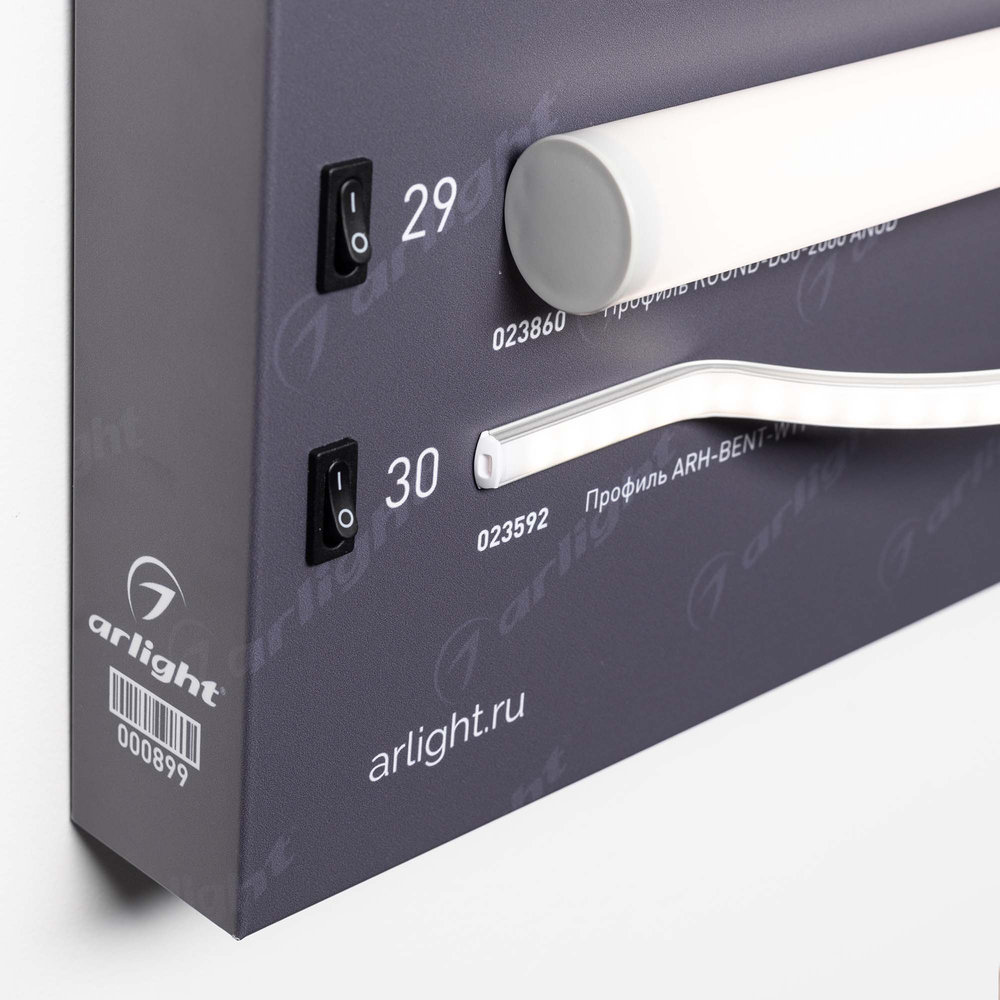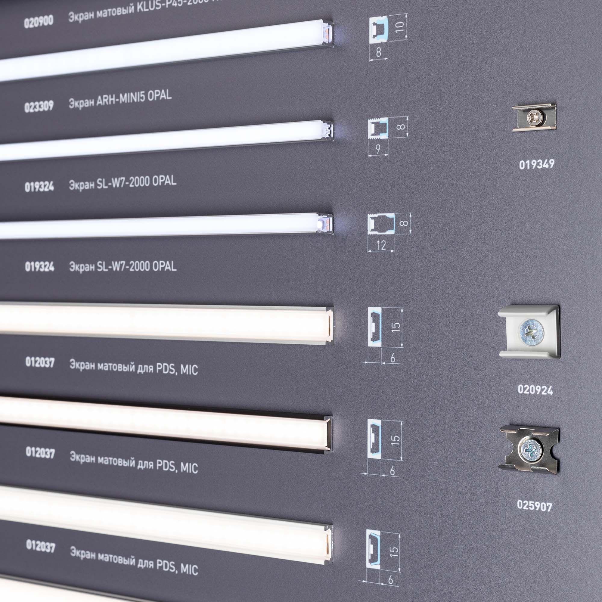 На стенде представлен ассортимент алюминиевых накладных профилей для светодиодных лент. Решения для декоративной подсветки.