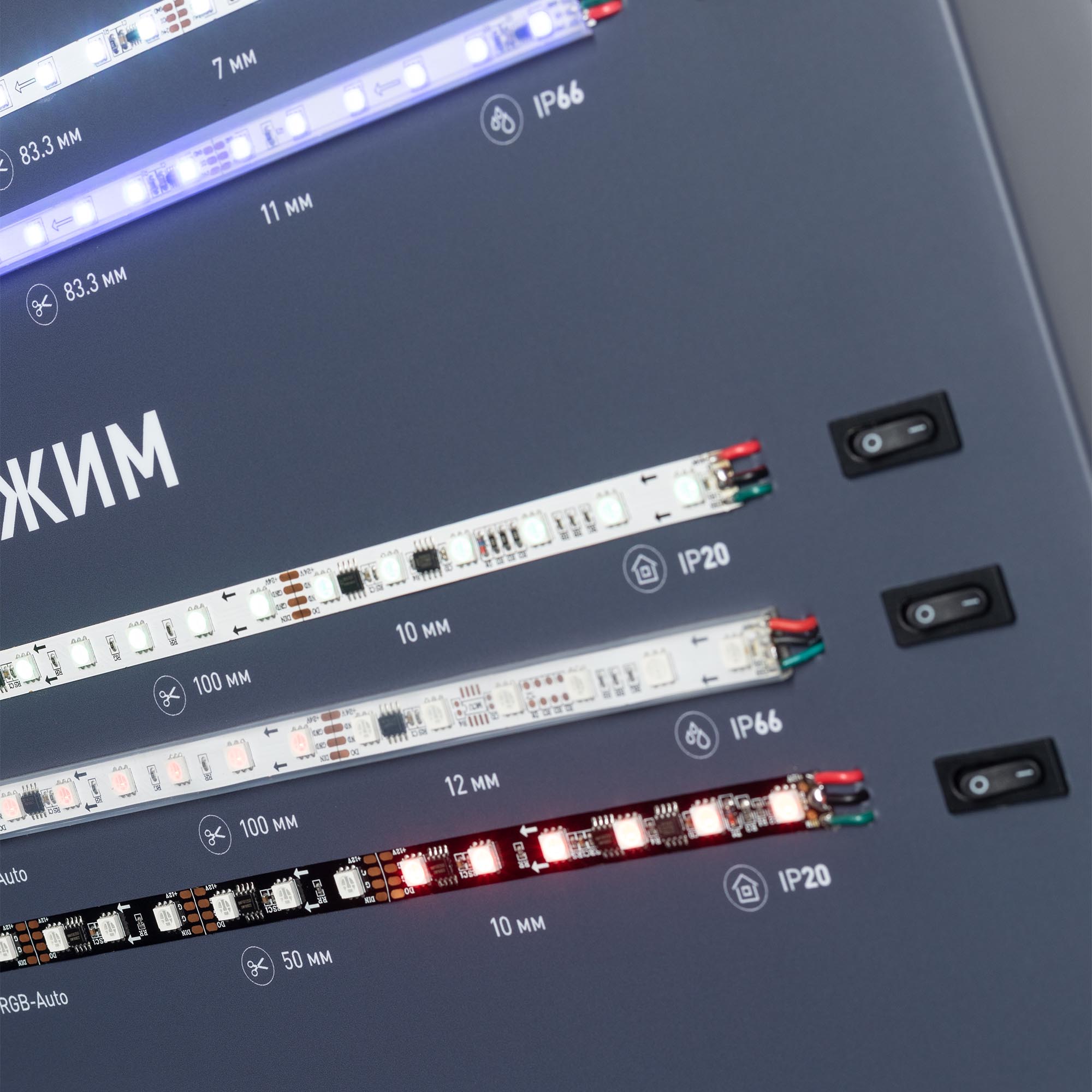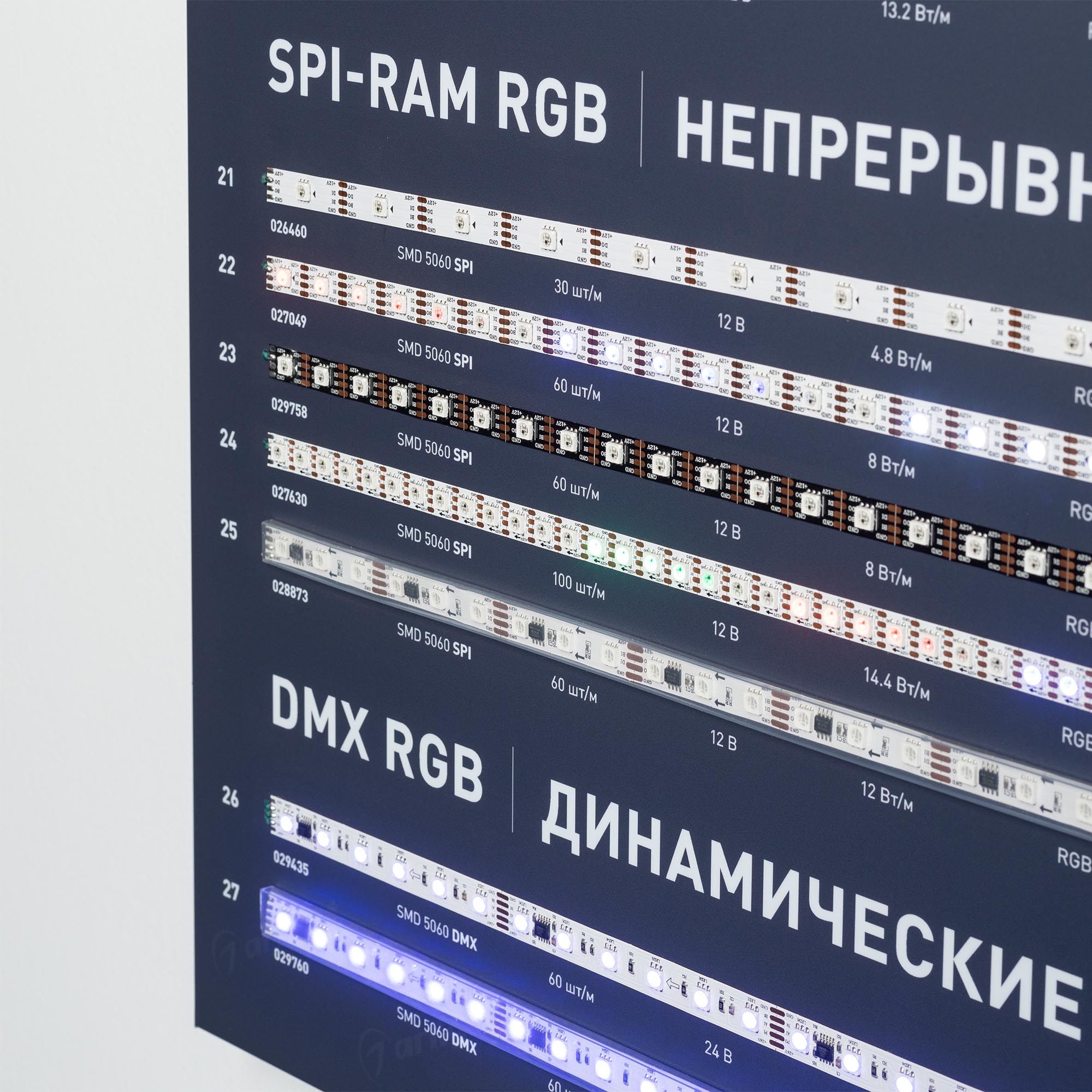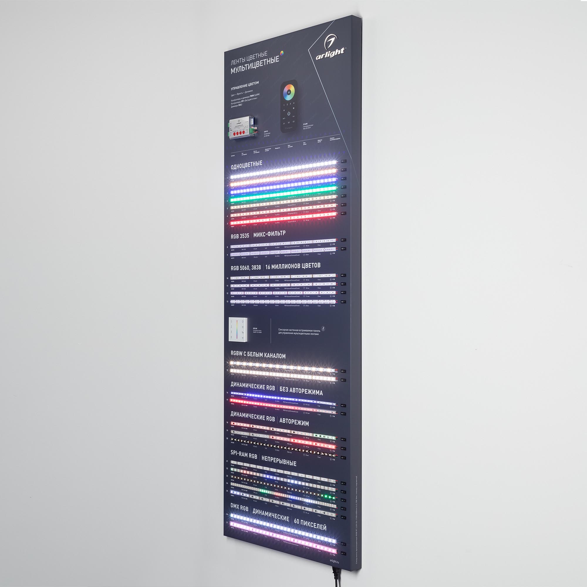 На стенде представлены различные мультицветные ленты: одноцветные, RGB, RGBW, динамические и непрерывные. Автоматические режимы управления, возможность ручной регулировки.