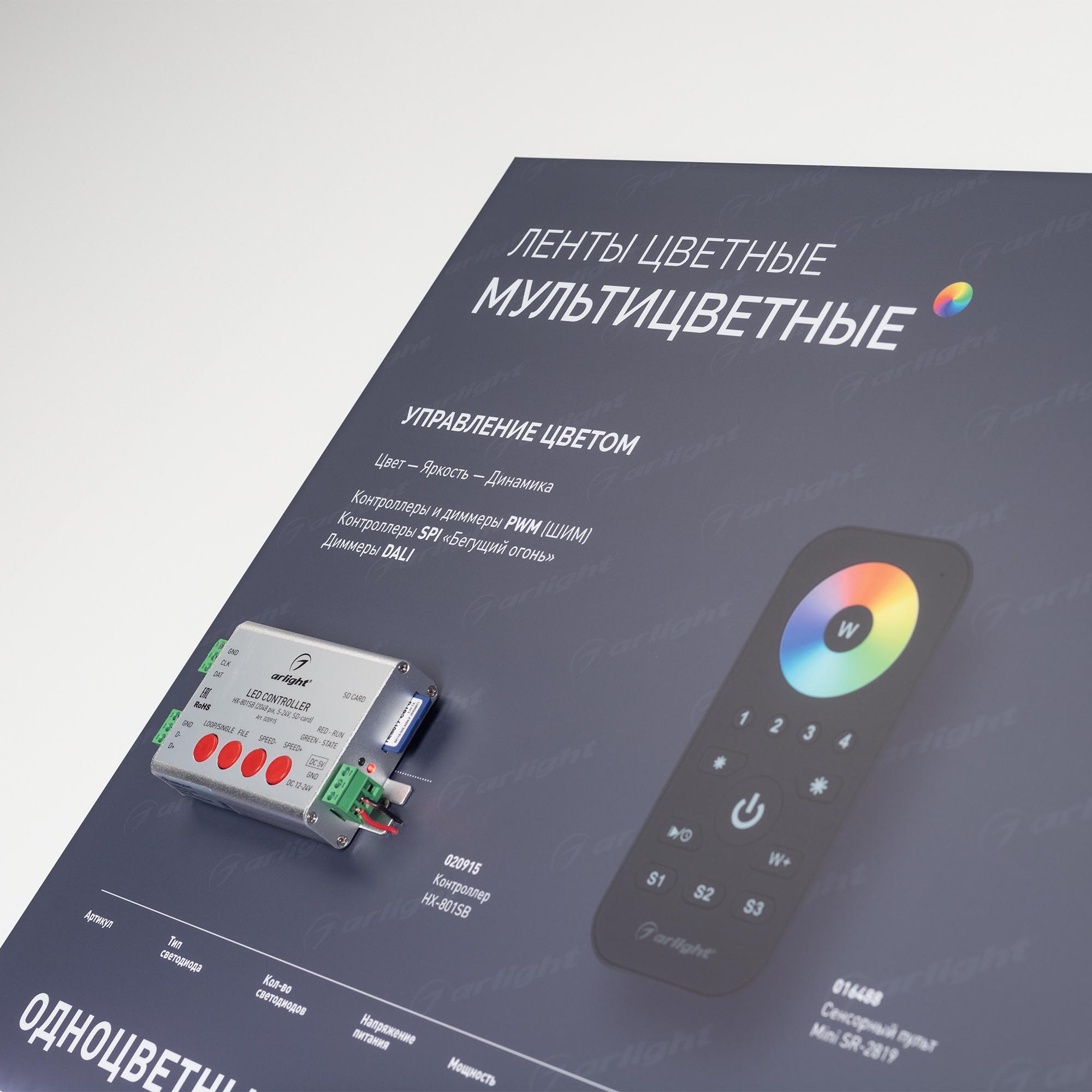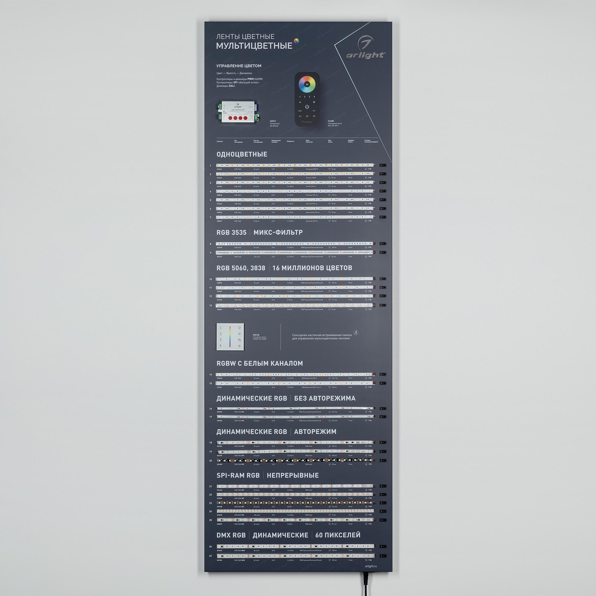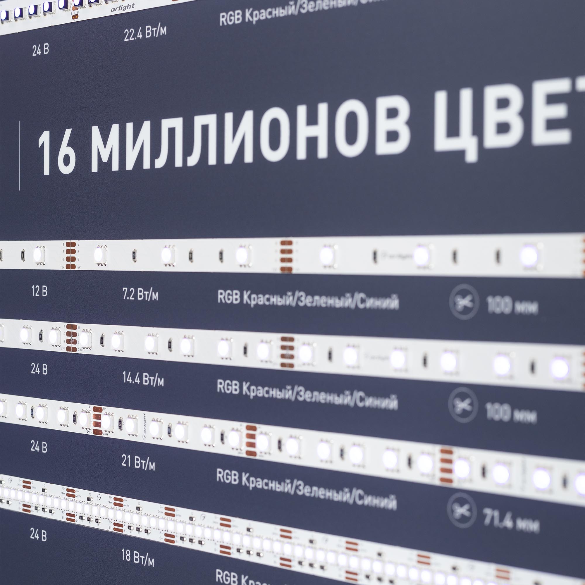 На стенде представлены различные мультицветные ленты: одноцветные, RGB, RGBW, динамические и непрерывные. Автоматические режимы управления, возможность ручной регулировки.