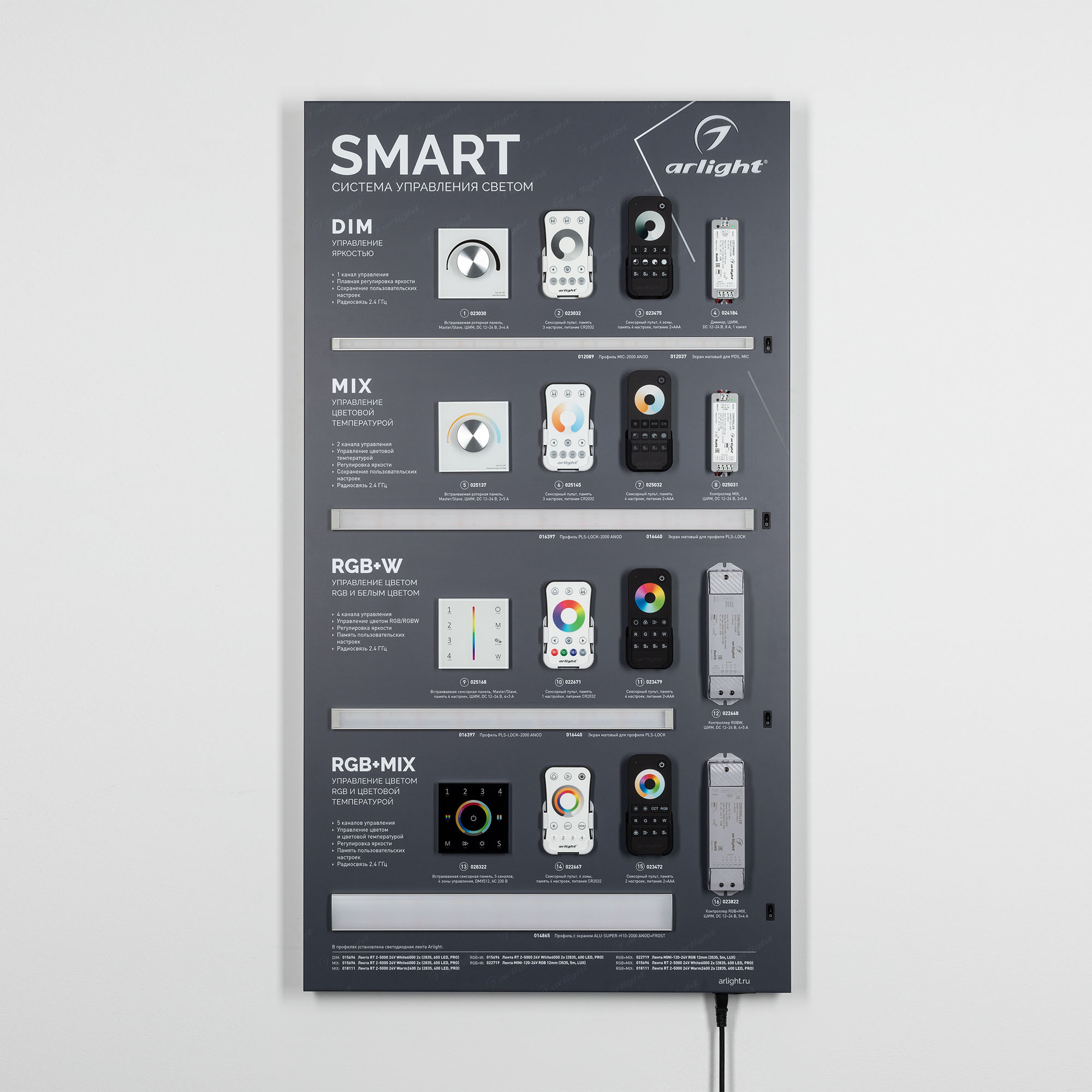 На стенде показаны возможности управления светодиодными лентами DIM, MIX, RGBW, RGB+MIX с помощью устройств серии SMART.