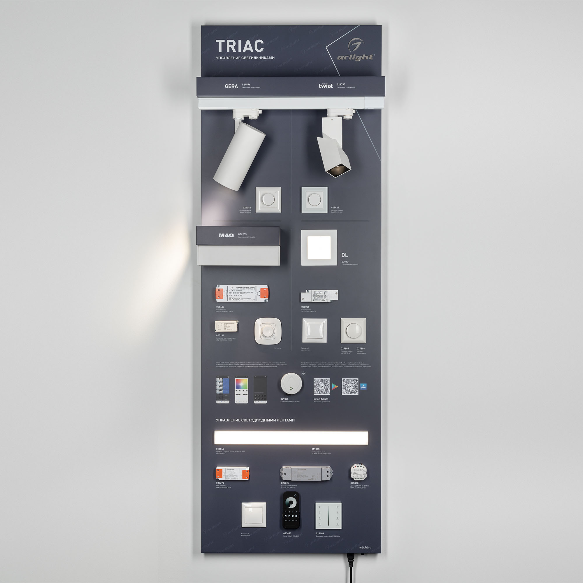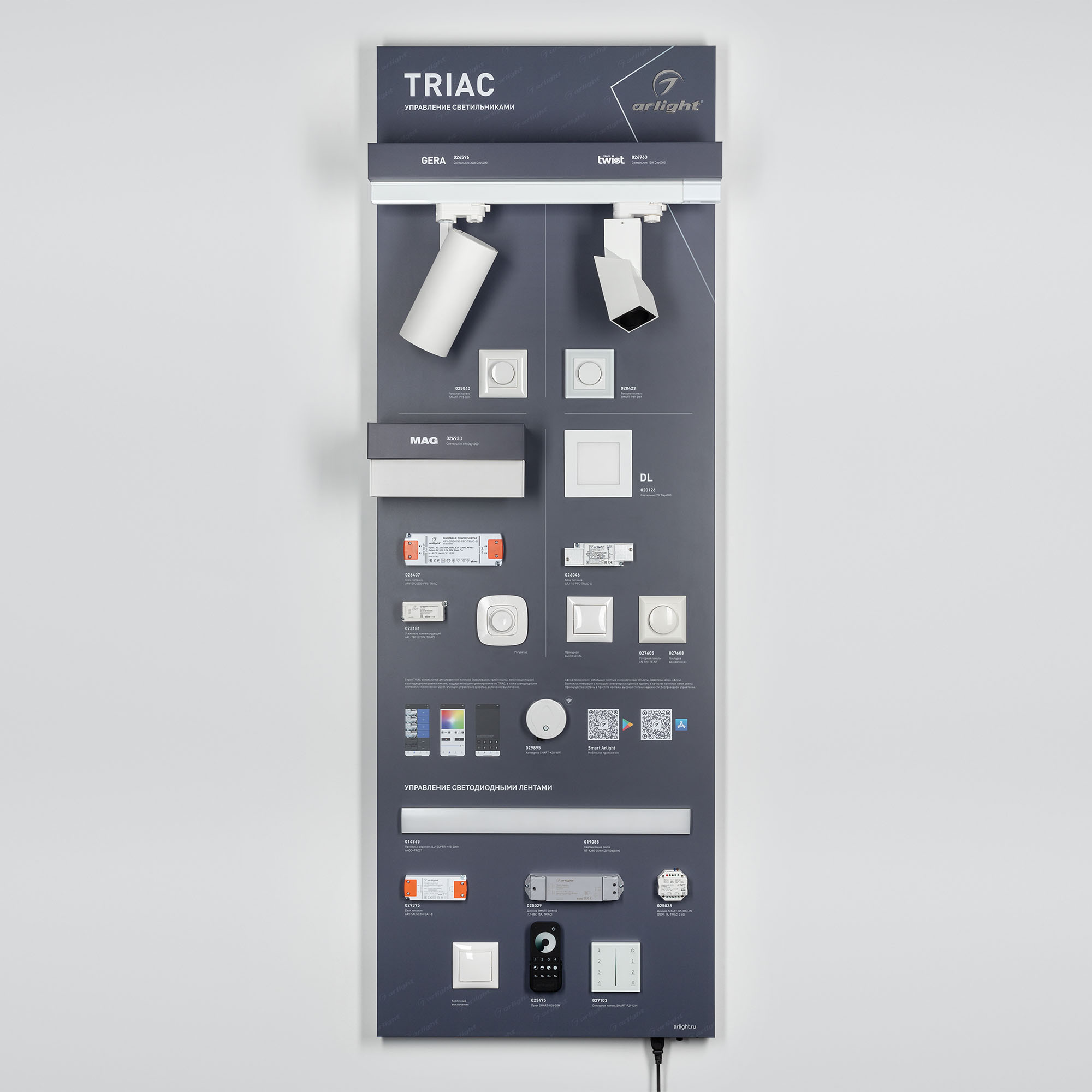 На стенде представлены возможности управления светильниками и светодиодной лентой с помощью устройств серии TRIAC.