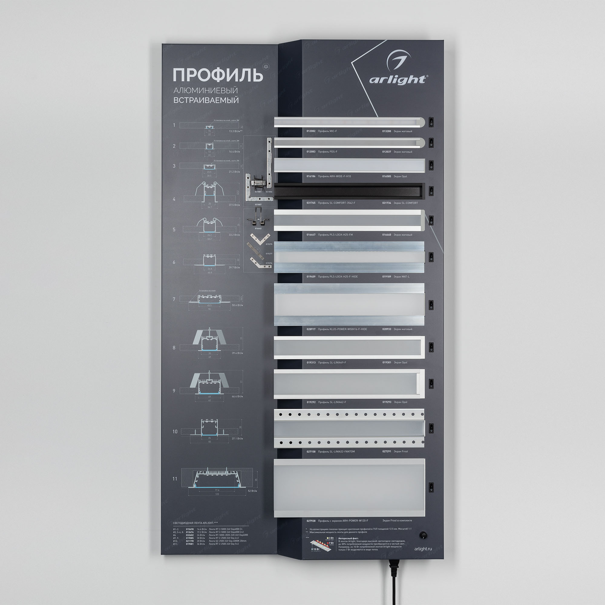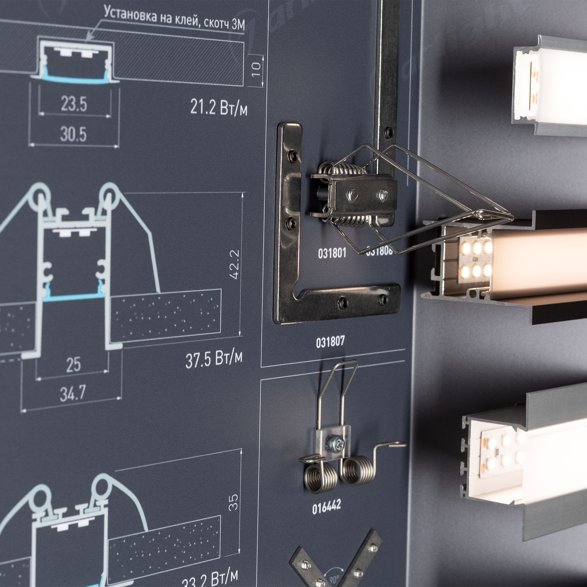 На стенде представлен ассортимент алюминиевых встраиваемых профилей для светодиодных лент для основного и декоративного освещения.