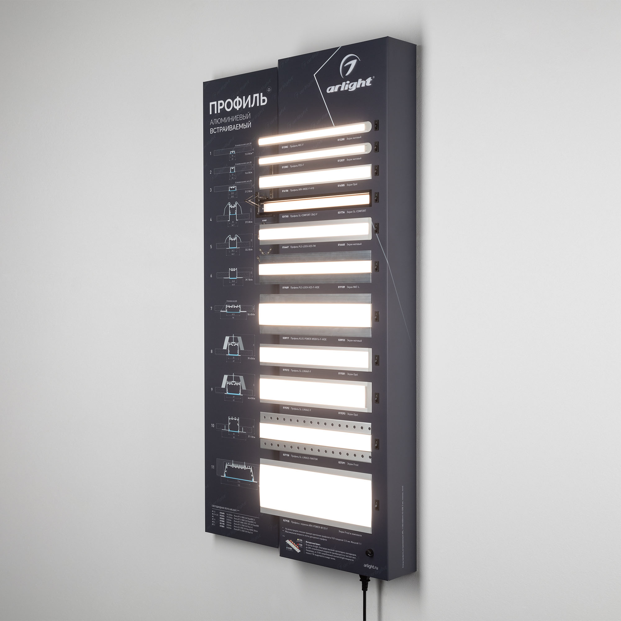 Встраиваемые алюминиевые профили серий S-LUX, ALU, ARH с подсветкой. Материал - алюмобонд. Габаритные размеры (Ширина Х Высота Х Глубина), 600х1100х90 мм.