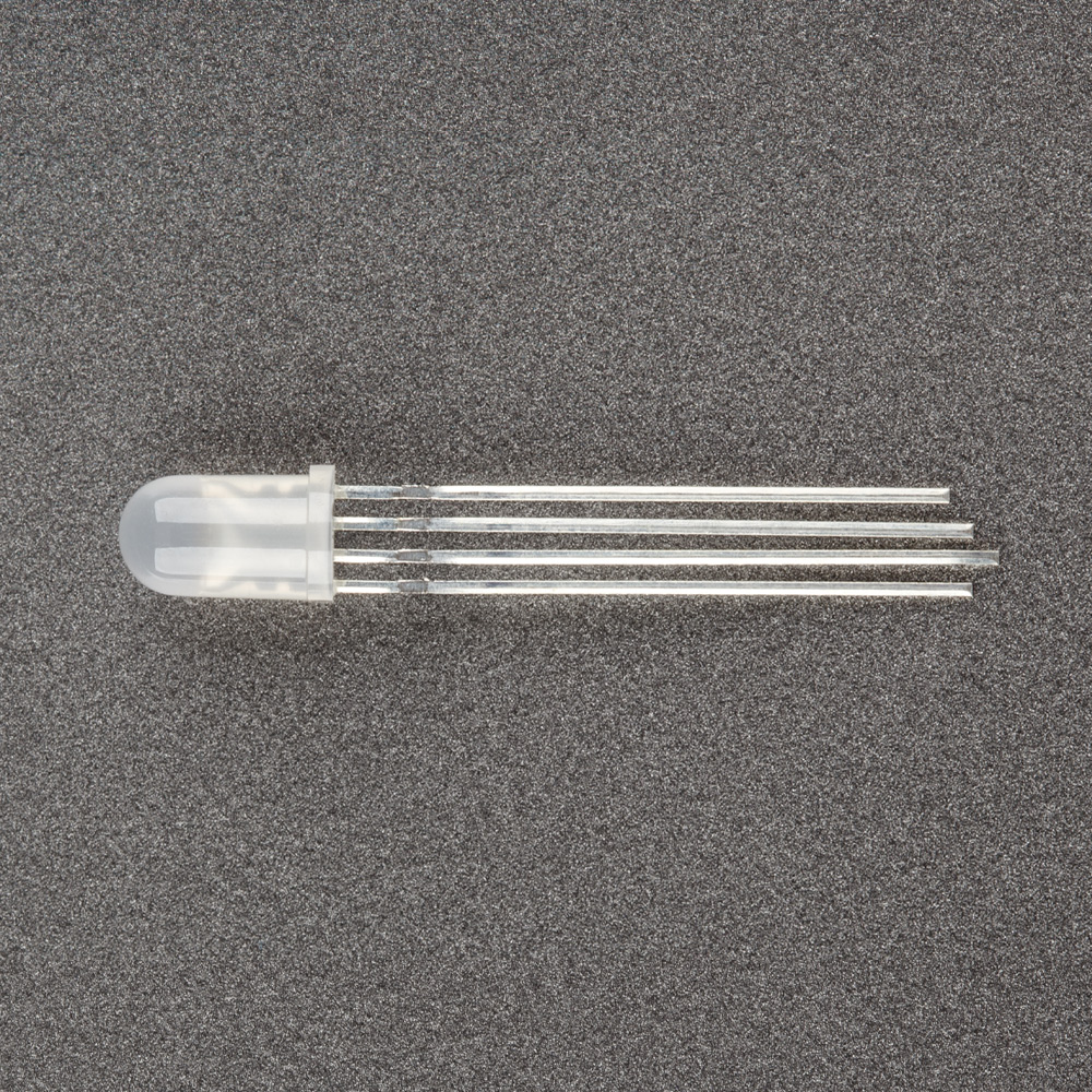Поставка под заказ от 5000 шт. Выводной круглый светодиод, d=5 мм, белая матовая линза. Цвет свечения RGB: красный (640 нм), зеленый (525 нм), синий (465 нм). Угол излучения 60°. Сила света Iv=800-1500 при If=20 мА. VF=1.9-2.5 В (красный). VF=2.9-3.5 В (зеленый/синий). Четыре вывода, общий анод.