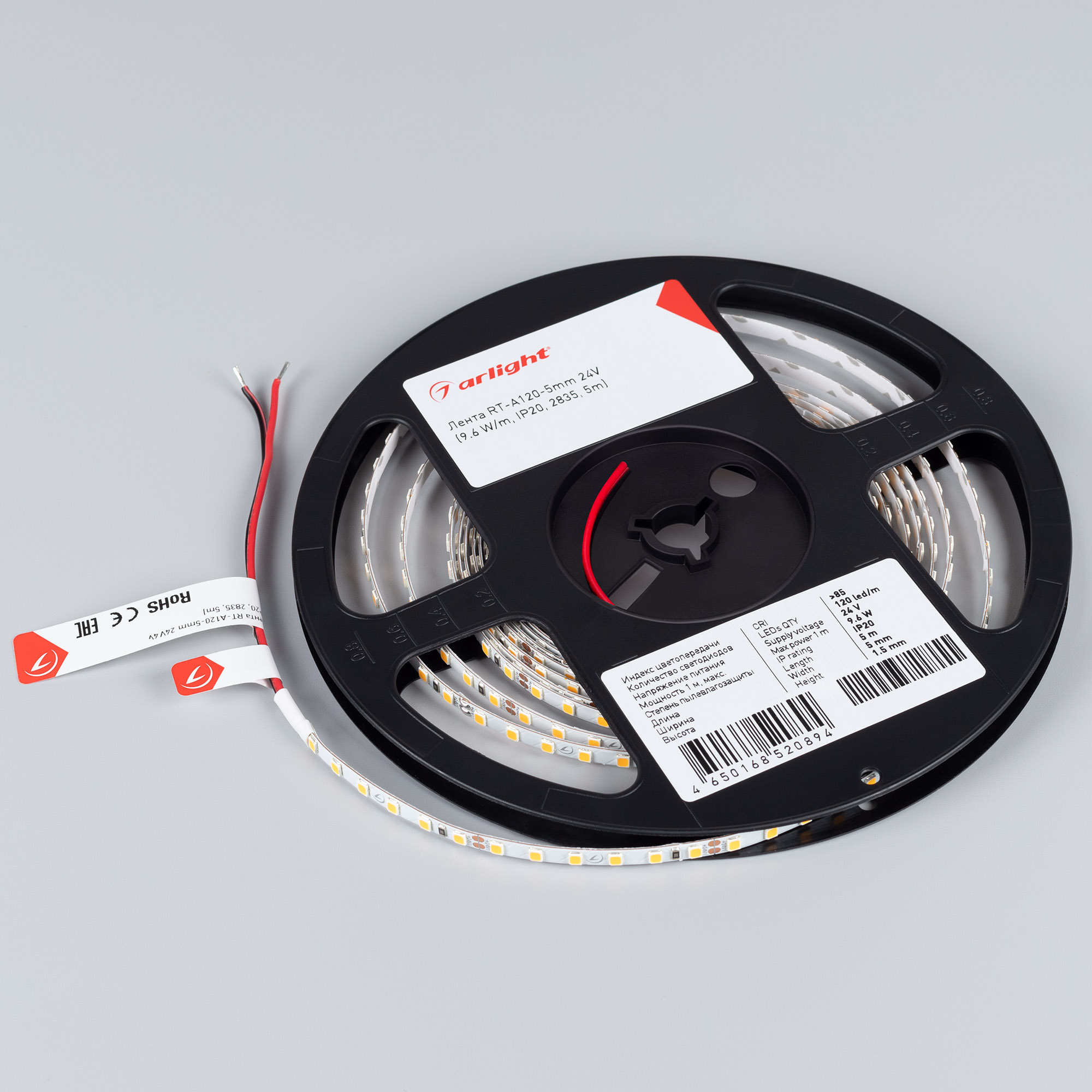 Узкая светодиодная лента RT серии A120 шириной 5 мм. Тип светодиода SMD 2835, 120 шт/м, холодного цвета свечения (15000K). Напряжение питания 24 В, мощность 9.6 Вт/м. Минимальный отрезок 50 мм (6 светодиодов). Универсальная лента для организации декоративной подсветки в помещениях, подсветка лестниц, ступеней, перил, плинтусов, ниш, мебельных полок, натяжных потолков, витражей. Узкая плата плата позволяет установить ленту в тонкий паз. Используется для рекламных конструкций и витрин.