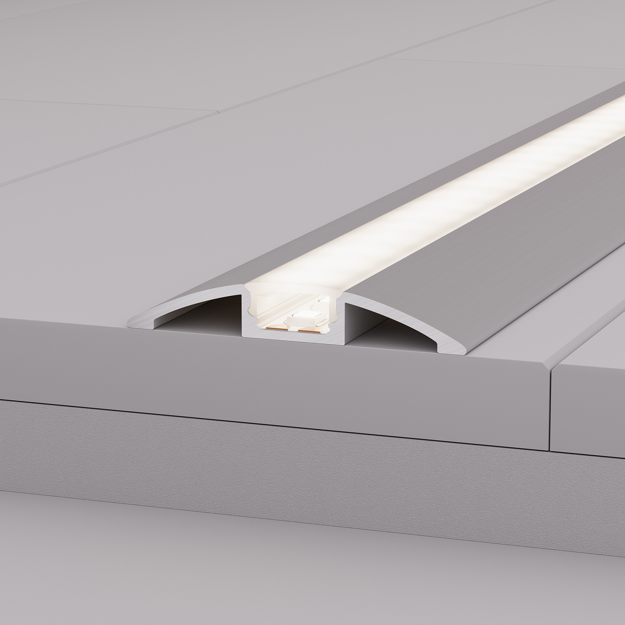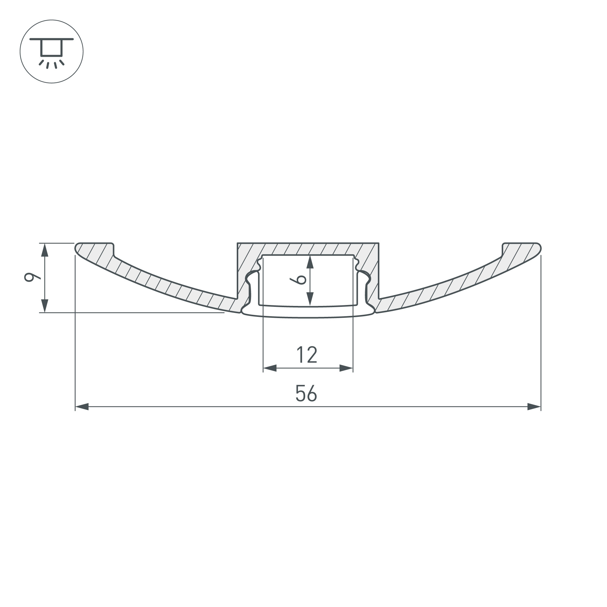Алюминиевый светотехнический профиль для установки светодиодной ленты или линейки. Цвет серебристый. Длина 2000 мм, размер сечения 56х9 мм. Специальная форма профиля позволяет использовать его в том числе на полу. Монтаж осуществляется накладным способом. Рассеиваемая тепловая мощность 31,7 Вт/м позволяет подобрать источник света необходимой яркости и температуры свечения и реализовать самые интересные решения. Профиль охлаждает светодиодную ленту, продлевая срок её службы и сохраняя яркость, а также защищает от воздействия пыли, влаги и других внешних факторов. Высококачественное анодированное покрытие защищает профиль от внешних воздействий и коррозии. Светотехнический профиль - отличное решение для создания современных световых проектов.