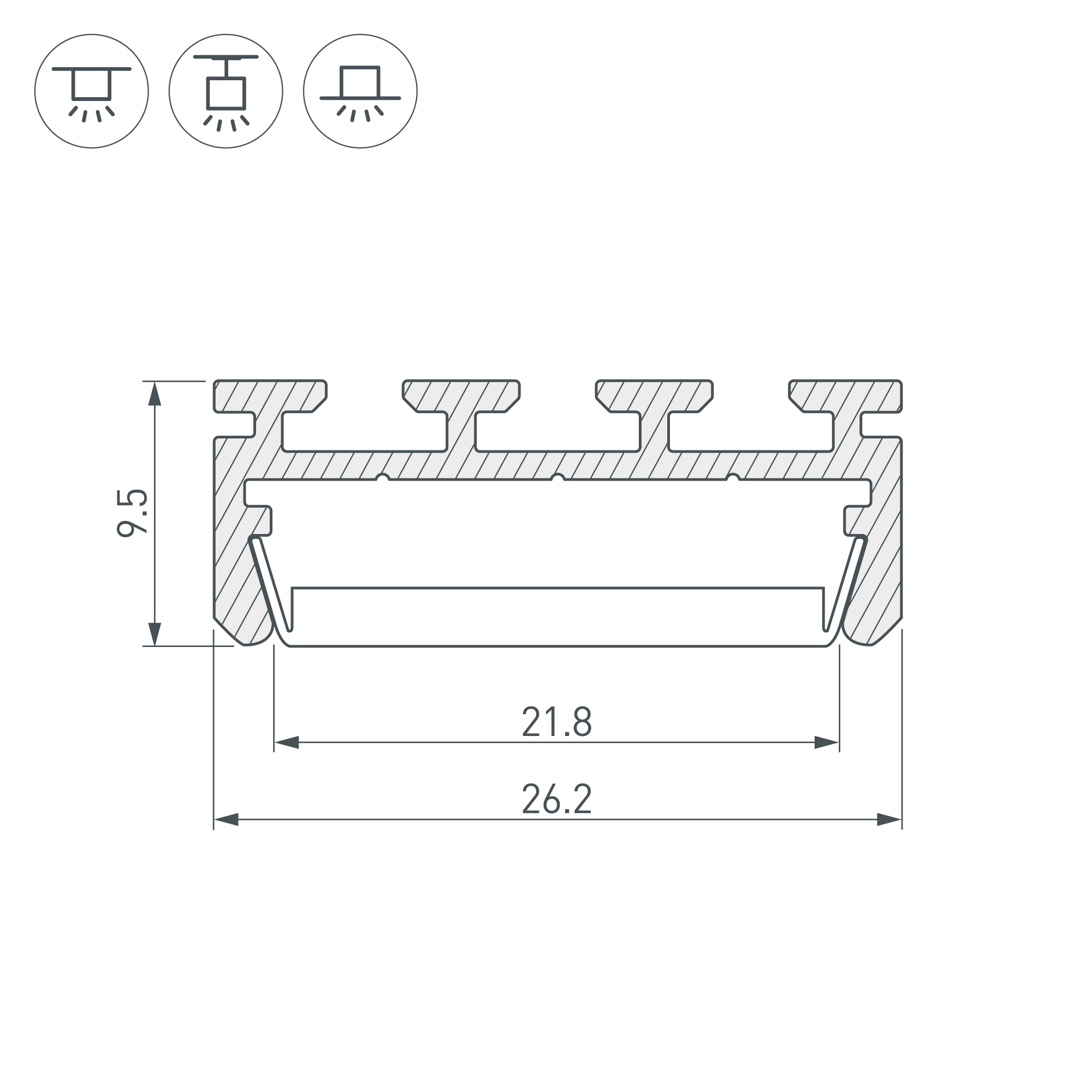 Накладной/подвесной/встраиваемый профиль из анодированного алюминия для основного освещения и контурной подсветки. Габаритные размеры профиля составляют 2000 мм в длину, 26,2 мм в ширину и 9,5 мм в высоту. Площадка для установки светодиодных лент позволяет использовать ленту шириной до 22 мм и мощностью до 18,3 Вт/м. Это обеспечивает гибкость в выборе светодиодных лент и создает потрясающие световые решения. Экраны, заглушки и другие аксессуары не включены в комплект и приобретаются отдельно. Цена указана за 1 метр профиля. Отличное решение для создания современных световых проектов.