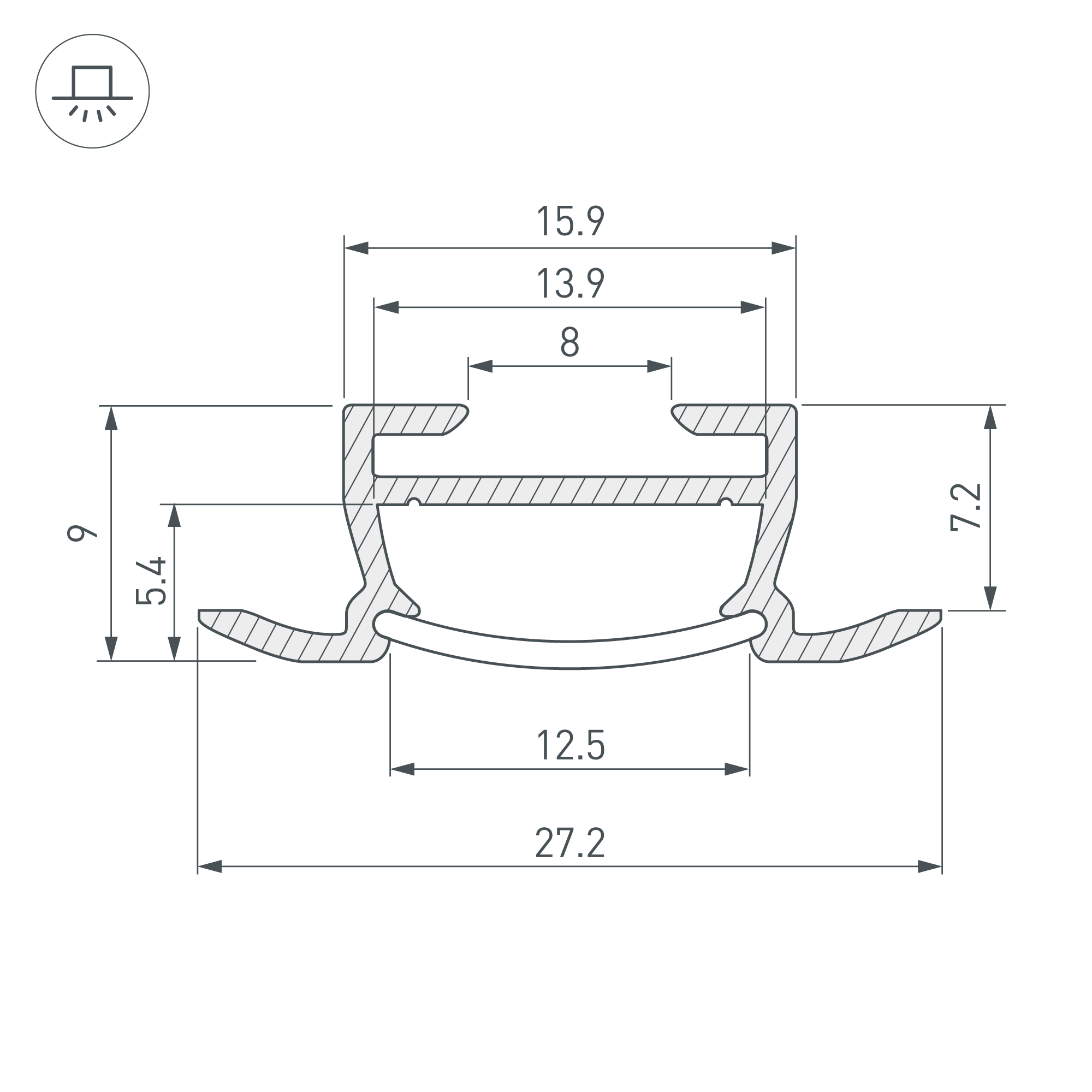 Габаритные размеры профиля составляют 2000 мм в длину, 27,2 мм в ширину и 9 мм в высоту. Площадка для установки светодиодных лент позволяет использовать ленту шириной до 13,9 мм и мощностью до 17 Вт/м. Это обеспечивает гибкость в выборе светодиодных лент и создает потрясающие световые решения.