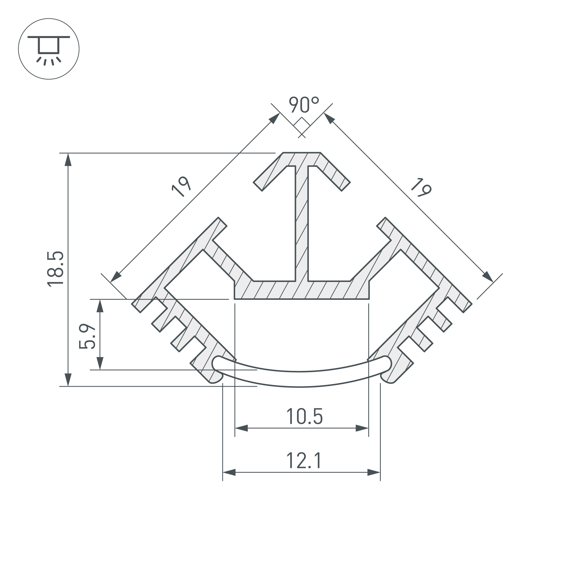 Угловой профиль из анодированного алюминия для подсветки мебели, ниш и других элементов интерьера. Габаритные размеры профиля составляют 2000 мм в длину, 19 мм в ширину и 19 мм в высоту. Площадка для установки светодиодных лент позволяет использовать ленту шириной до 10,5 мм и мощностью до 20 Вт/м. Это обеспечивает гибкость в выборе светодиодных лент и создает потрясающие световые решения.