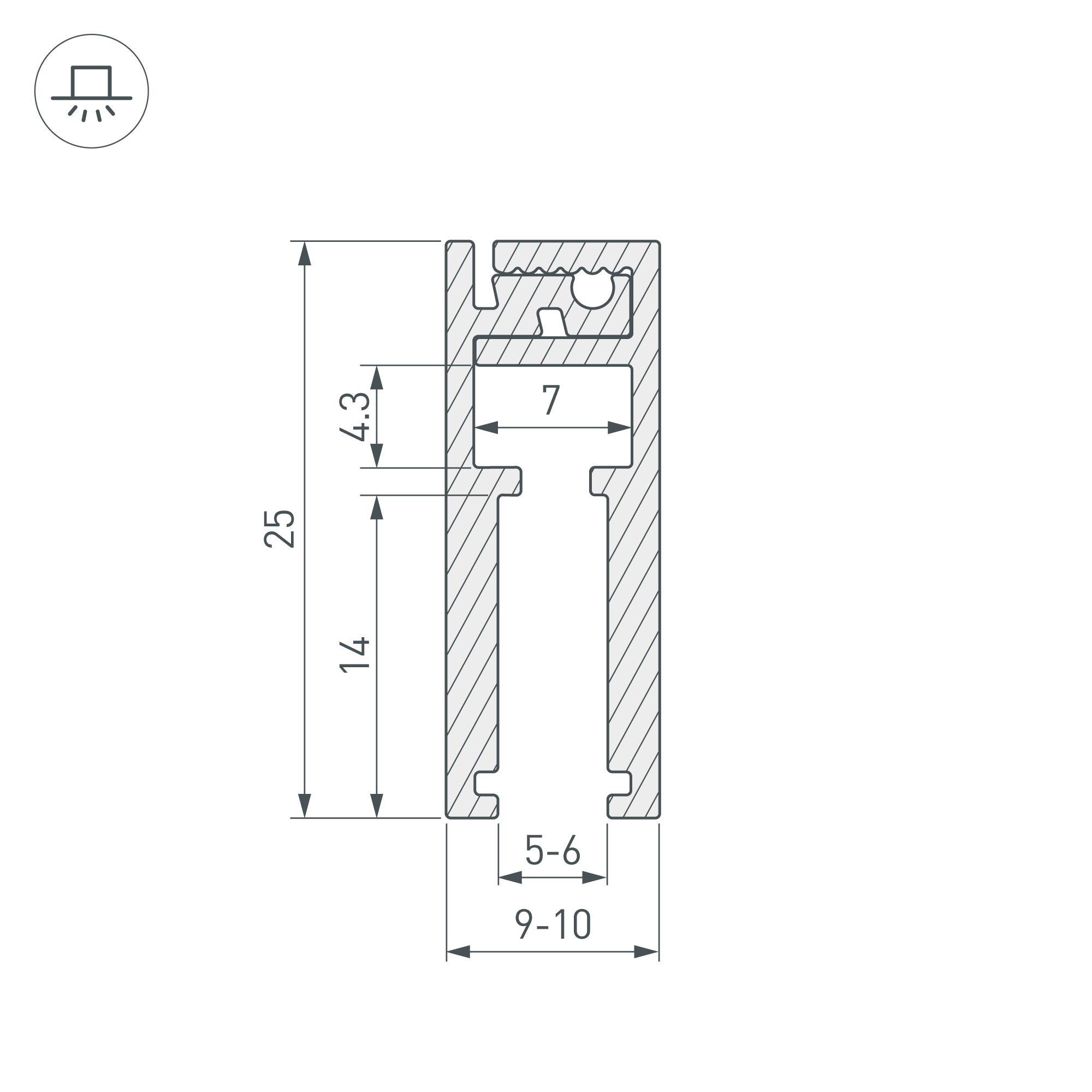 Двухкомпонентный накладной профиль из анодированного алюминия для подсветки стекла толщиной от 5-6 мм. Фиксируется на кромке стекла на глубину 14мм при помощи 2-х стороннего скотча. Габаритные размеры профиля составляют 2000 мм в длину, 25 мм в ширину и 9-10 мм в высоту в зависимости от толщины стекла. Площадка для установки светодиодных лент позволяют использовать ленту шириной до 7 мм и мощностью до 18 Вт/м. Это обеспечивает гибкость в выборе светодиодных лент и создает потрясающие световые решения.