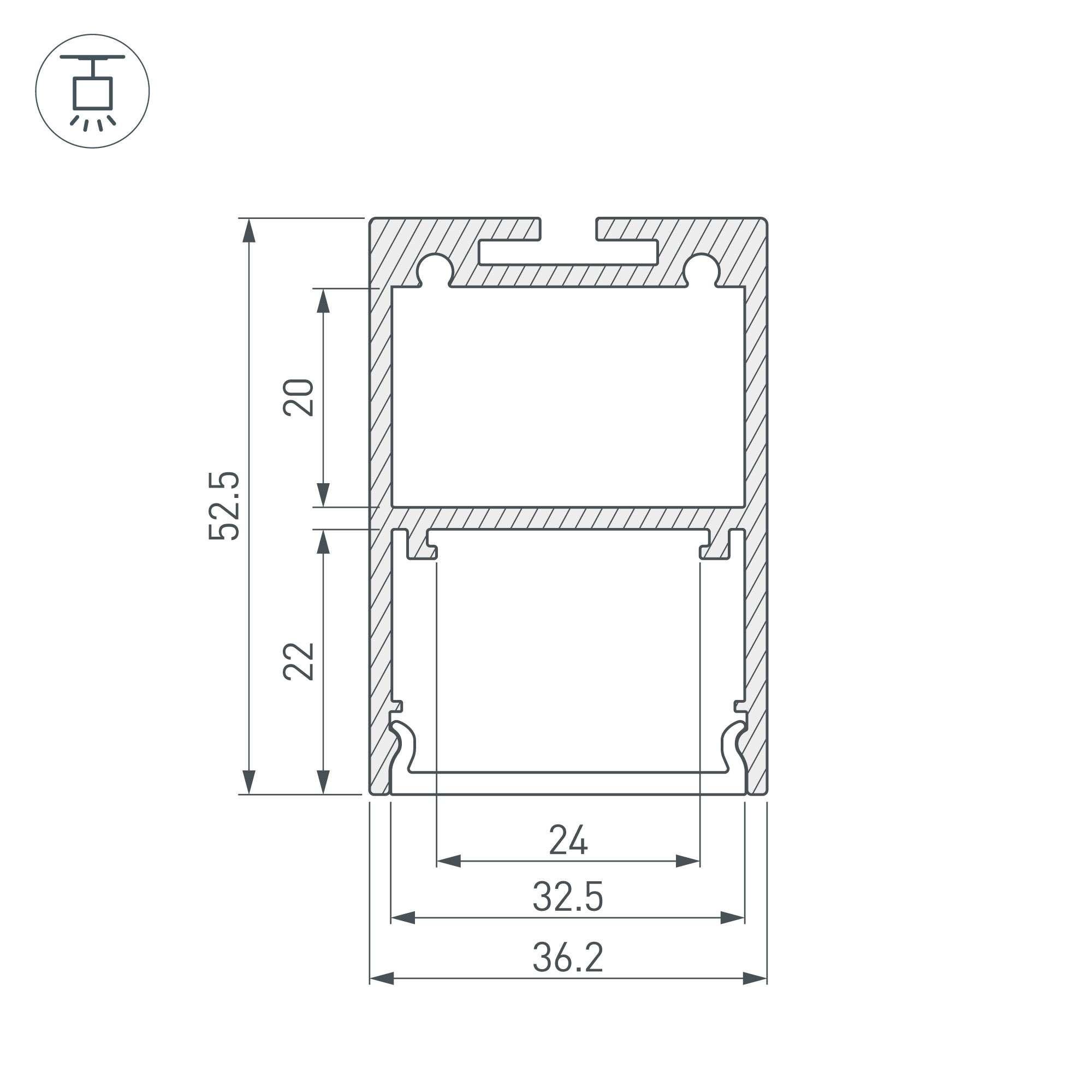 Алюминиевый анодированный подвесной профиль для светодиодных лент и линеек, с отсеком для блока питания (размер отсека 32х20 мм). Габаритные размеры (L×W×H): 2000x36,2x52,5 мм. Ширина площадки для ленты 24 мм. Экраны, заглушки и другие аксессуары приобретаются отдельно. Цена за 1 метр.