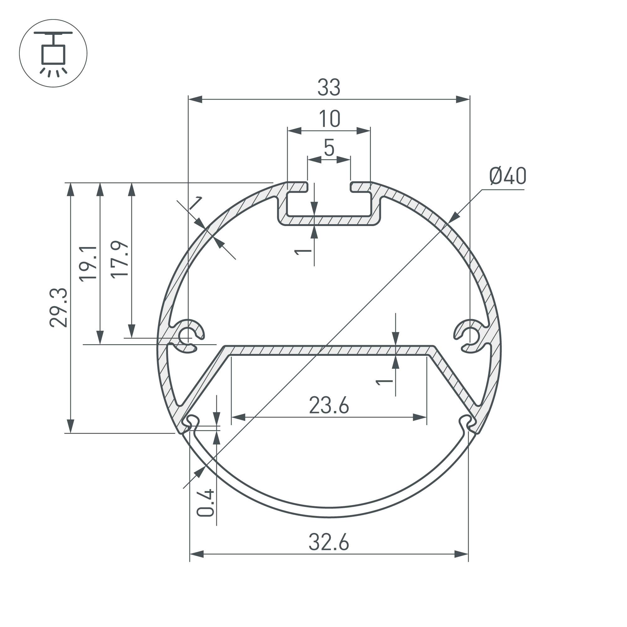Подвесной профиль из анодированного алюминия в комплекте с круглым рассеивателем со светопропусканием 85% идеален для основного освещения. Габаритные размеры профиля с круглым рассеивателем составляют 2500 мм в длину, 40 мм в ширину и 40 мм в высоту. Площадка для установки светодиодных лент позволяет использовать ленту шириной до 23,6 мм и мощностью до 22,3 Вт/м. Это обеспечивает гибкость в выборе светодиодных лент и создает потрясающие световые решения.