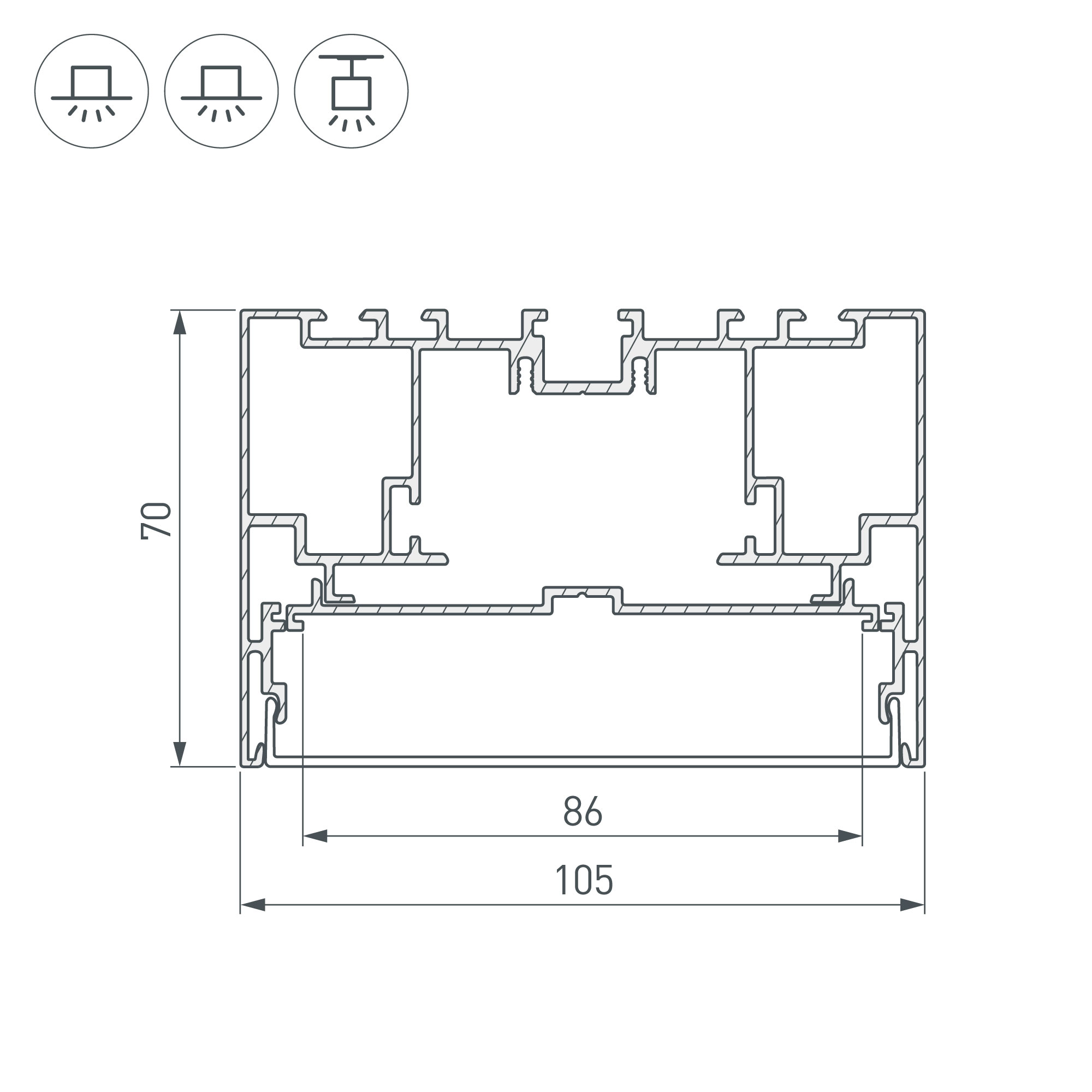 Отсек для блока питания (50х25 мм) и съемная площадка для светодиодной ленты с фиксаторами значительно облегчают сервисное обслуживание осветительного оборудования. Габаритные размеры профиля составляют 2500 мм в длину, 105 мм в ширину и 70 мм в высоту. Площадка для установки светодиодных лент позволяет использовать ленту шириной до 86 мм и мощностью до 91 Вт/м. Это обеспечивает гибкость в выборе светодиодных лент и создает потрясающие световые решения.