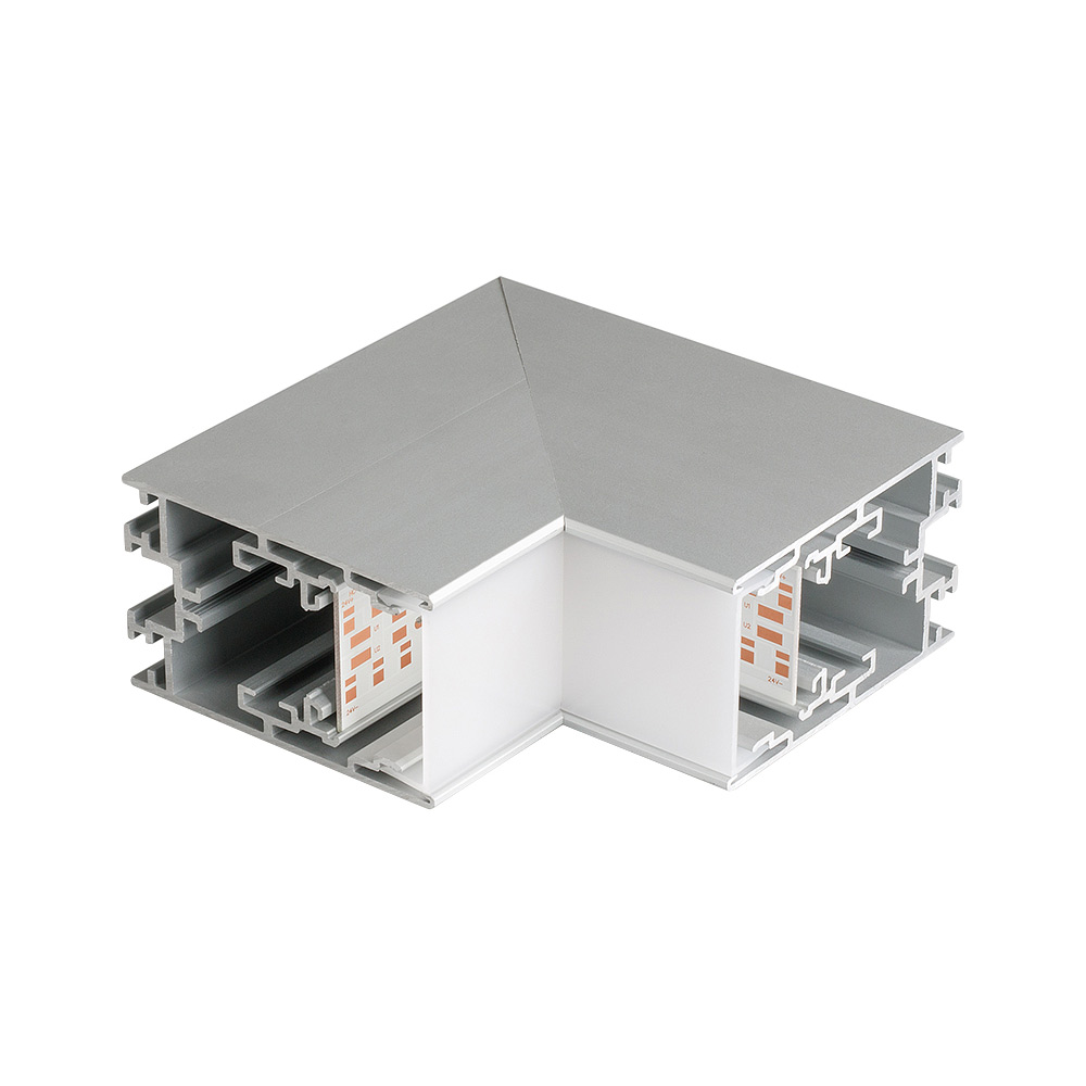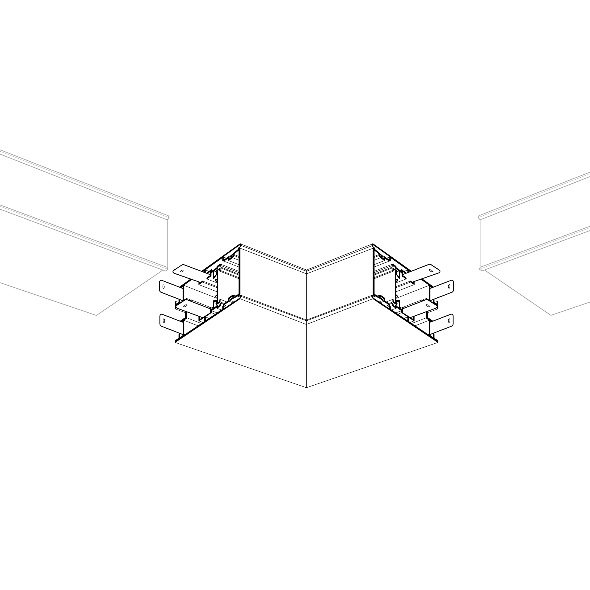 Внутренний прямой угол в сборе для соединения двух профилей S2-LINE-4067 под прямым углом 90° в разных плоскостях в комплекте с матовым экраном, площадкой для ленты и соединителями. Экран образует линию внутри угла. Применятся при изготовлении светильников сложной геометрии.