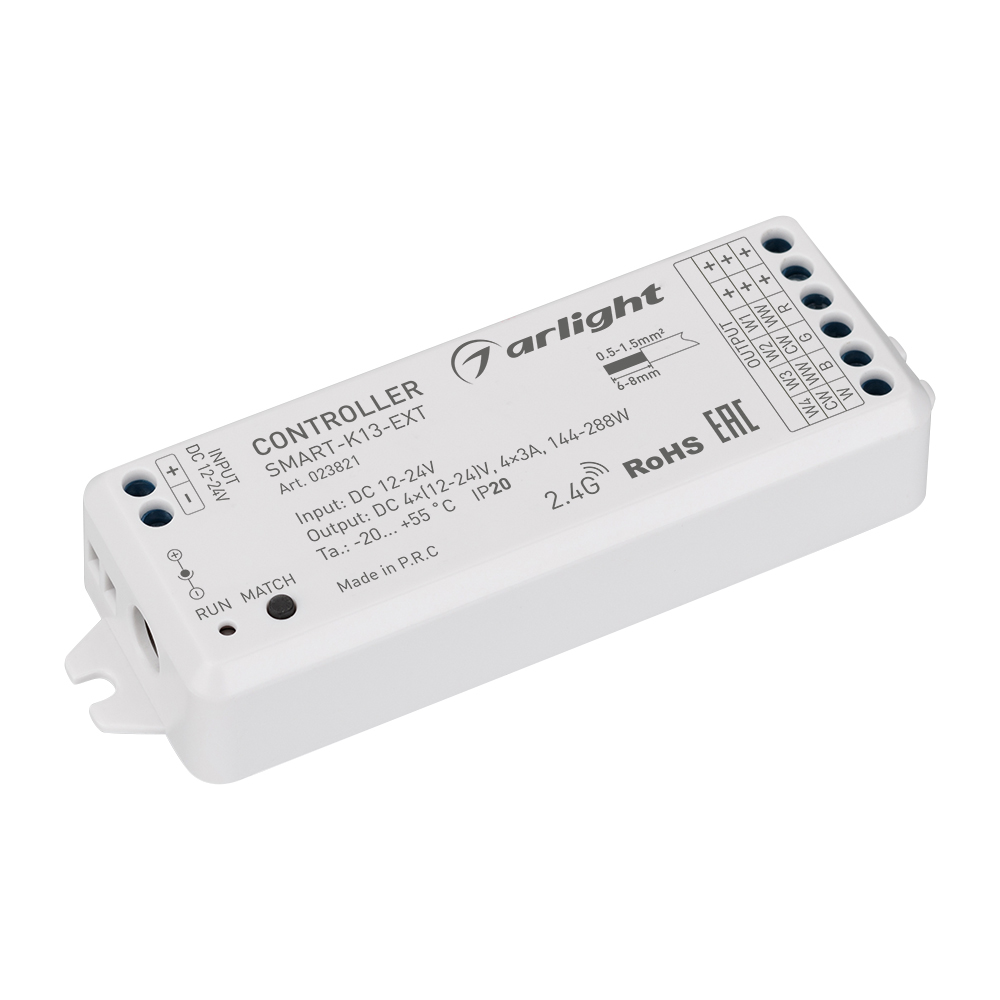 Диммер для управления мультицветными (RGBW) светодиодными лентами по ШИМ и другими светодиодными источниками света с напряжением питания 12-24В. Выполняет основные фукнции: включение/выключение, регулировка яркости и цвета, а также осуществляет синхронизацию с аналогичными устройствами на расстоянии до 15 метров с общей длиной системы до 100 метров. Устройство совместимо с радиочастотными пультами дистанционного управления и настенными панелями управления серии SMART. Возможна привязка до 10 пультов или панелей управления. Питание от 12-24В, 4 канала управления, максимальная нагрузка 3А на канал, выходная мощность 144-288 Вт (в зависимости от напряжения питания). Габариты устройства 114x38x20 мм.