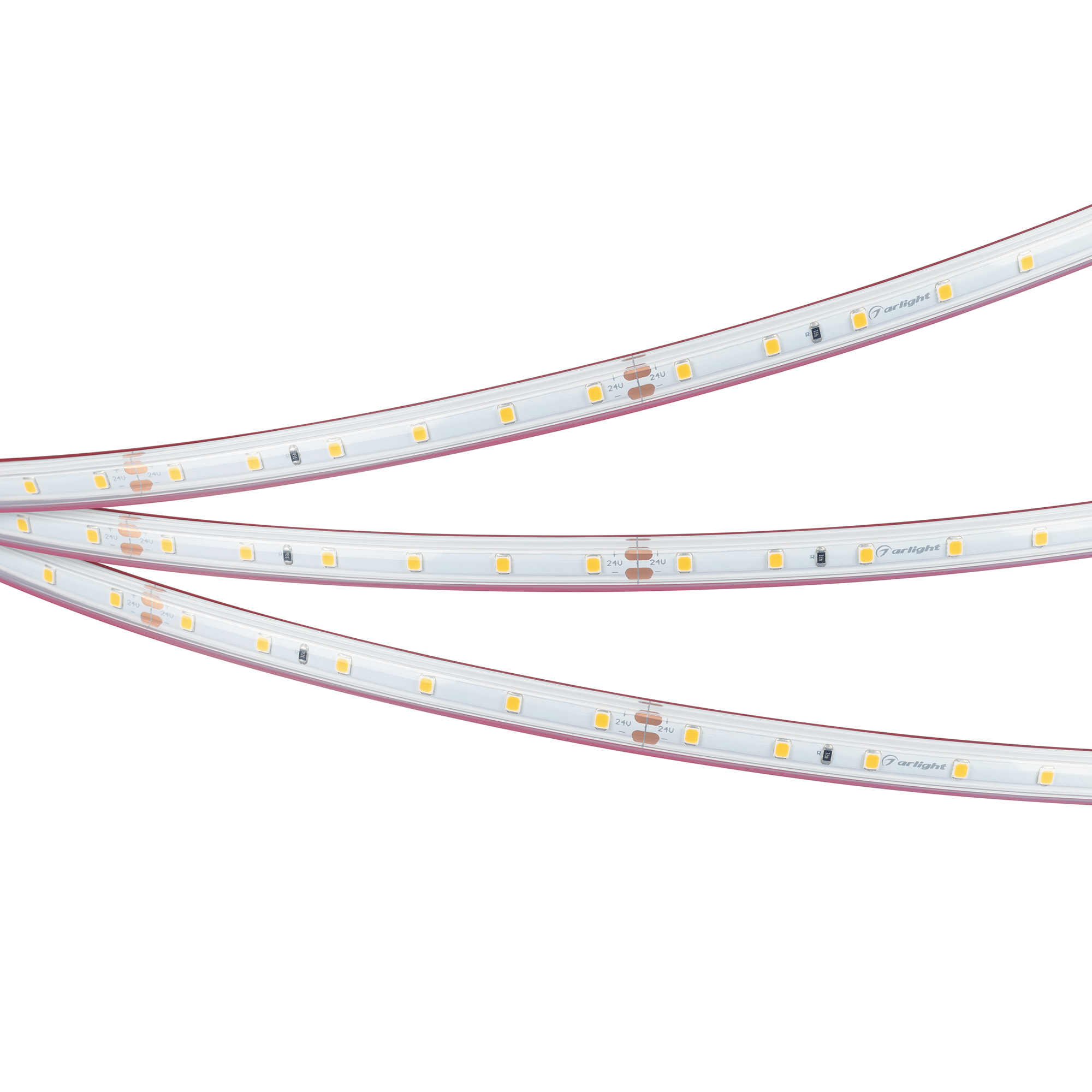 Светодиодная герметичная лента RTW серии A60 (монтажная бобина 50 м), IP67 (PS - силиконовая экструзия). Светодиоды SMD 2835, 60 шт/м, белая плата шириной 8 мм, скотч 3M. Цвет ТЕПЛЫЙ 2700K, индекс цветопередачи CRI>85, угол 120°. Питание 24 В, мощность 4.8 Вт/м (240 Вт на 50 м). Размеры 50000x10x5 мм. Мин. отрезок 100 мм, 6 светодиодов. Цена за 1 м. Разрезать перед подключением. Макс. длина подключения 5 м.