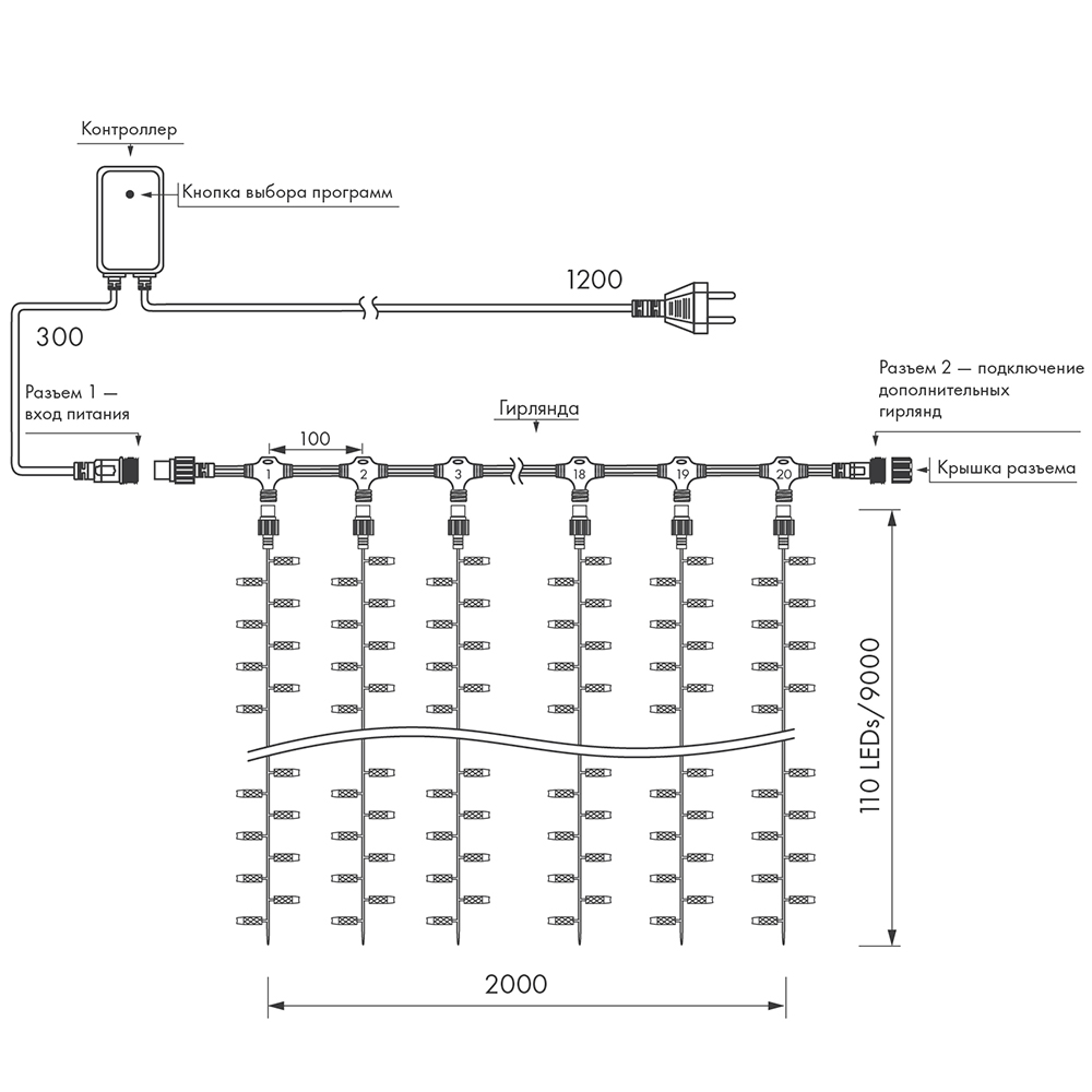 Светодиодный Занавес Classic. Размер 2000x9000 мм (длина 2000 мм, высота 9000 мм). 20 ниспадающих нитей длиной 9000 мм. 2200 светодиодов размером 7 мм. Цвет свечения ТЕПЛЫЙ БЕЛЫЙ (3000 К), постоянное свечение и 8 динамических эффектов с резким световым рисунком (прозрачная вогнутая линза). Провод прозрачный, ПВХ. Питание 230 В, Мощность 120 Вт, защита IP65, применение в помещении и на улице под навесом. Аксессуар для подключения и выбора режима свечения в комплекте.