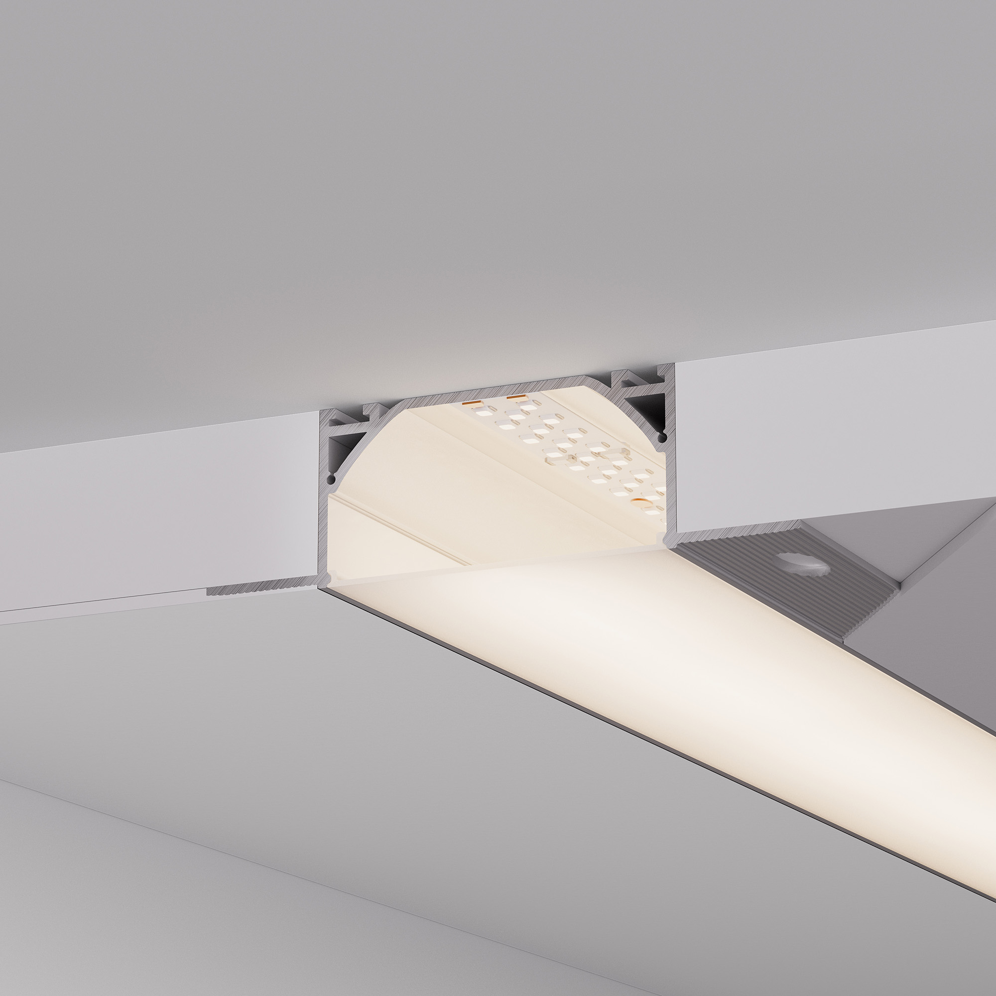 Встраиваемый профиль со скрытым фланцем под строительную отделку из анодированного алюминия для основного освещения и контурной подсветки.