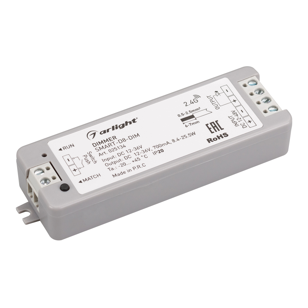 Диммер тока для светильников. Питание/рабочее напряжение 12-36VDC, максимальный ток 700mA на канал, 1 канал, максимальная мощность 8.4-25.2W. Винтовые клеммы. Корпус - PVC. Габариты 97x33x18 мм. Управляется пультами и панелями серии SMART (поставляются отдельно).