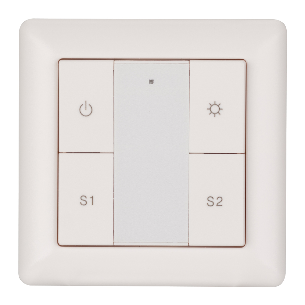 Встраиваемая пластиковая панель белого цвета с кнопочным управлением, предназначенная для управления одноцветными светодиодными лентами, светильниками и другими источниками света в системах управления светом DALI. Позволяет включать/выключать свет в одной группе, менять его яркость, сохранять и вызывать до 2 световых сцен. Установка номера группы и сцен выполняется переключателями на задней стороне панели. Устройство совместимо с диммерами стандарта DALI. Передача команд от панели к диммерам выполняется по общей двухпроводной шине DALI. Удобное и точное управление при помощи отдельных механических кнопок для каждой функции. Питание от шины DALI. Габариты устройства составляют 81х81х22.5 мм. Панель совместима с декоративными рамками ведущих мировых производителей (GIRA, JUNG, BERKER, MERTEN). Стандартная рамка входит в комплект поставки.