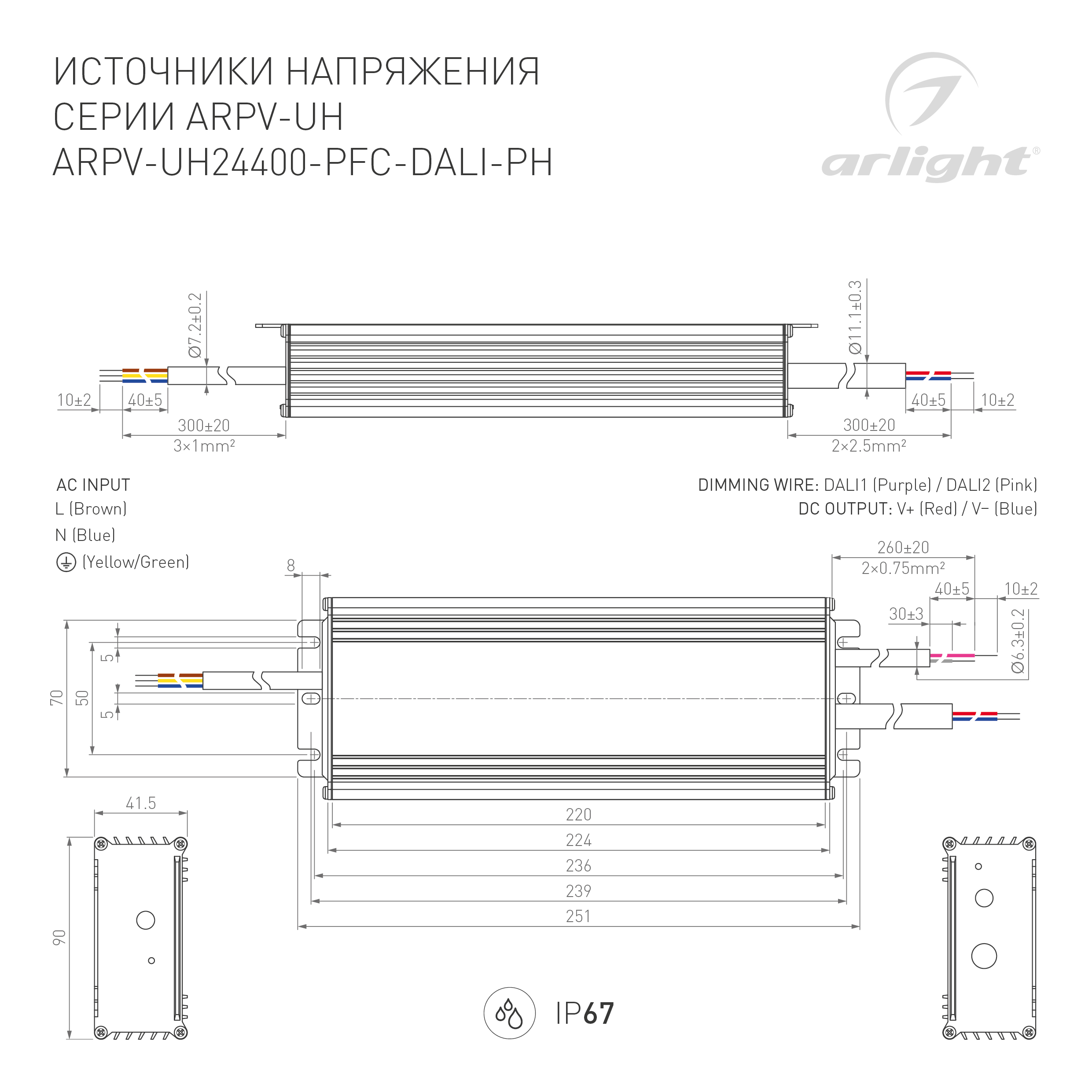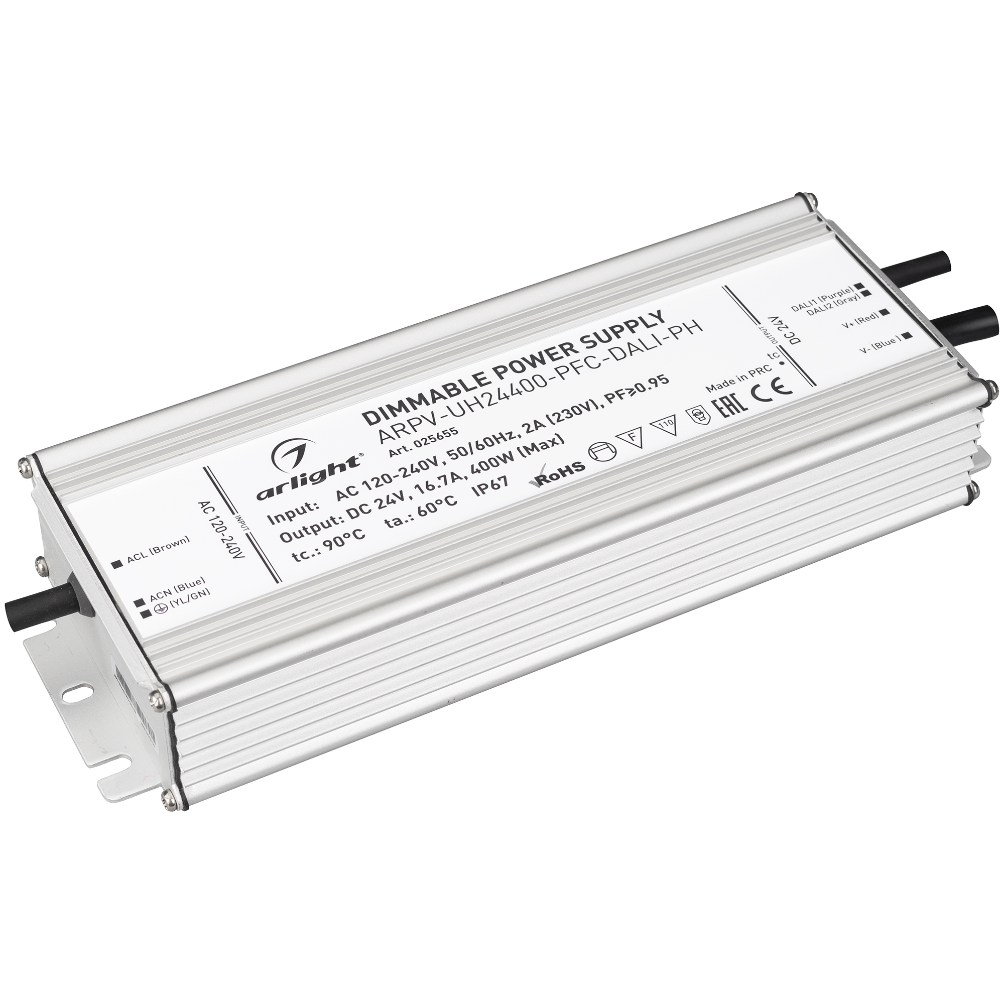 Диммируемый источник напряжения по протоколу DALI с гальванической развязкой для светодиодных изделий. Входное напряжение 120-240 VAC. Выходные параметры: 24 В, 16.7 А, 400 Вт. Встроенный PFC >0.95. Герметичный алюминиевый корпус IP 67. Рабочая температура -40…+70C⁰. Габаритные размеры длина 251 мм, ширина 90 мм, высота 41.5 мм. Гарантийный срок 7 лет. Режим CV+CC - при превышении выходной мощности снижается напряжение, переходит в режим источника тока.