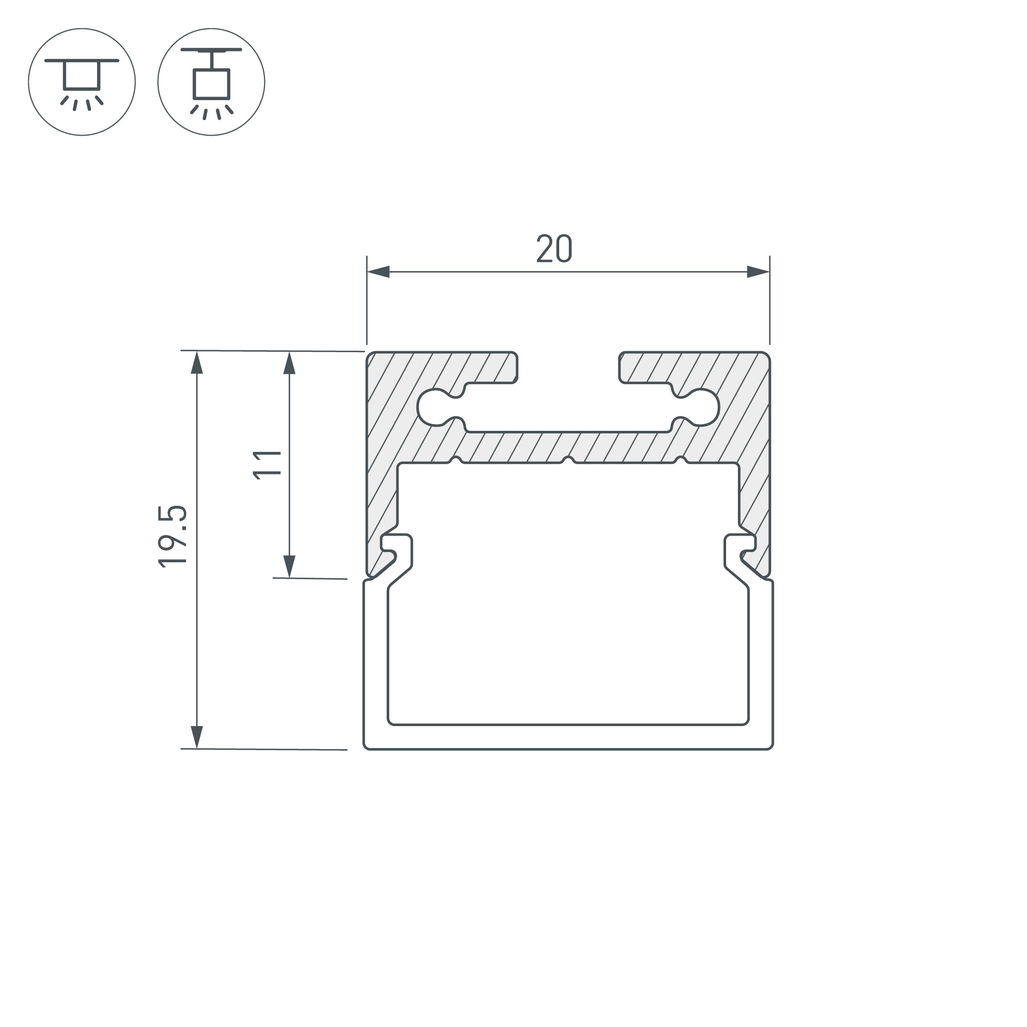Габаритные размеры профиля с экраном составляют 2500 мм в длину, 20 мм в ширину и 19,5 мм в высоту. Площадка для установки светодиодных лент позволяет использовать ленту шириной до 16,5 мм и мощностью до 16,2 Вт/м. Это обеспечивает гибкость в выборе светодиодных лент и создает потрясающие световые решения.