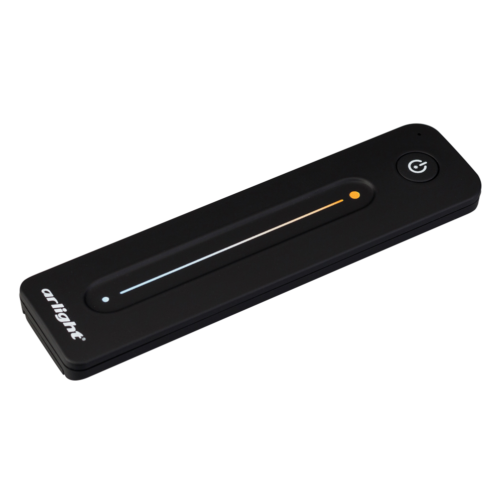 Радиочастотный пульт-слайдер чёрного цвета, предназначенный для управления мультибелыми (MIX) источниками света. Поддерживает основные функции: включение и выключение света, регулировку яркости, изменение цветовой температуры, управление 1 световой зоной. Устройство совместимо с диммерами и контроллерами серии SMART, поддерживающими управление по радиоканалу 2.4G. К одному пульту возможно привязать неограниченное количество диммеров и контроллеров. Питание 3В осуществляется от батарейки CR2032. Корпус пульта выполнен из пластика с покрытием Soft-Touch. Габариты устройства 139x36x11 мм.