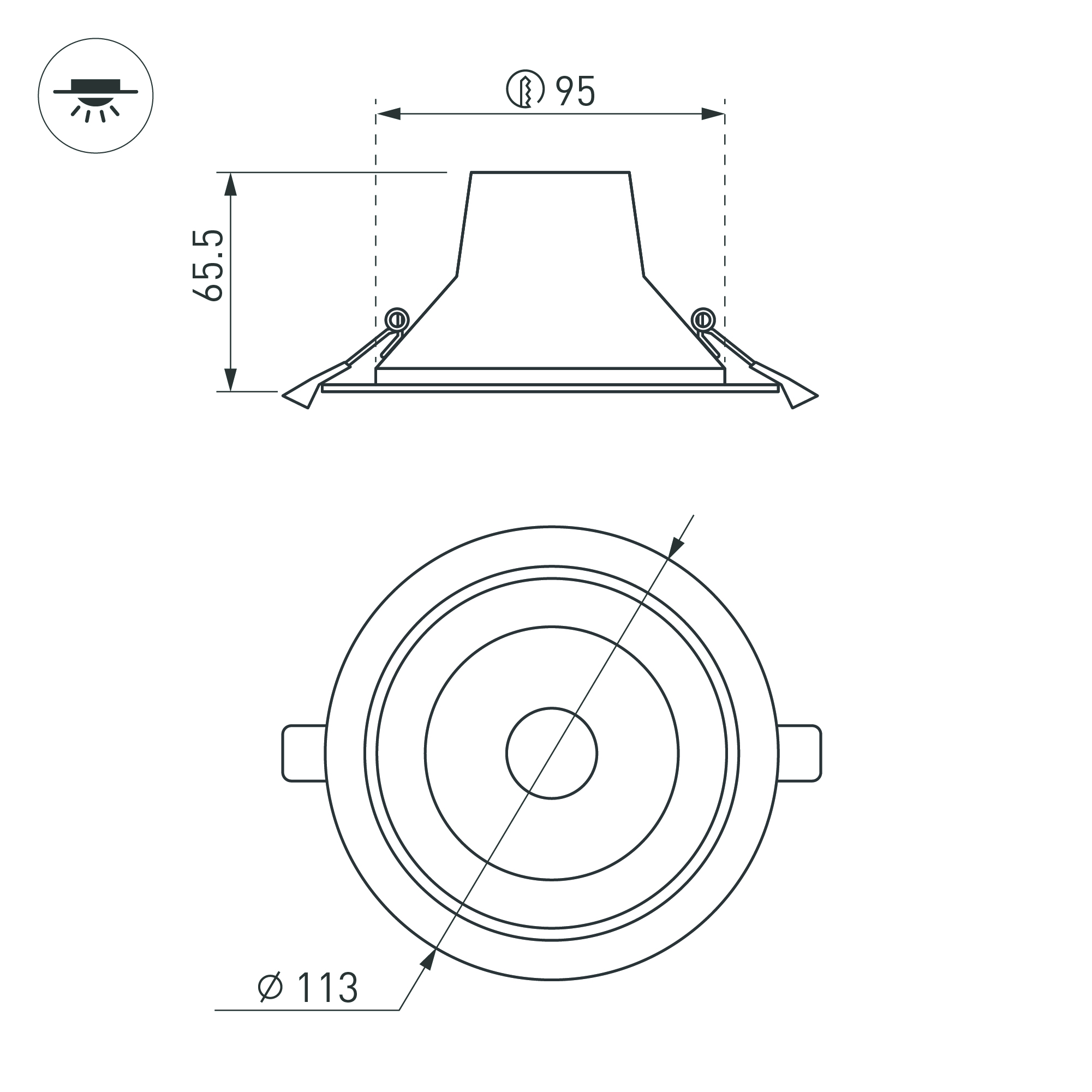 Светильник легко устанавливается с помощью крепежных пружин в монтажное отверстие диаметром 90–102 мм. В комплекте поставляется драйвер, что позволяет безопасно и быстро подключать светильник напрямую к сети переменного тока 230 В.