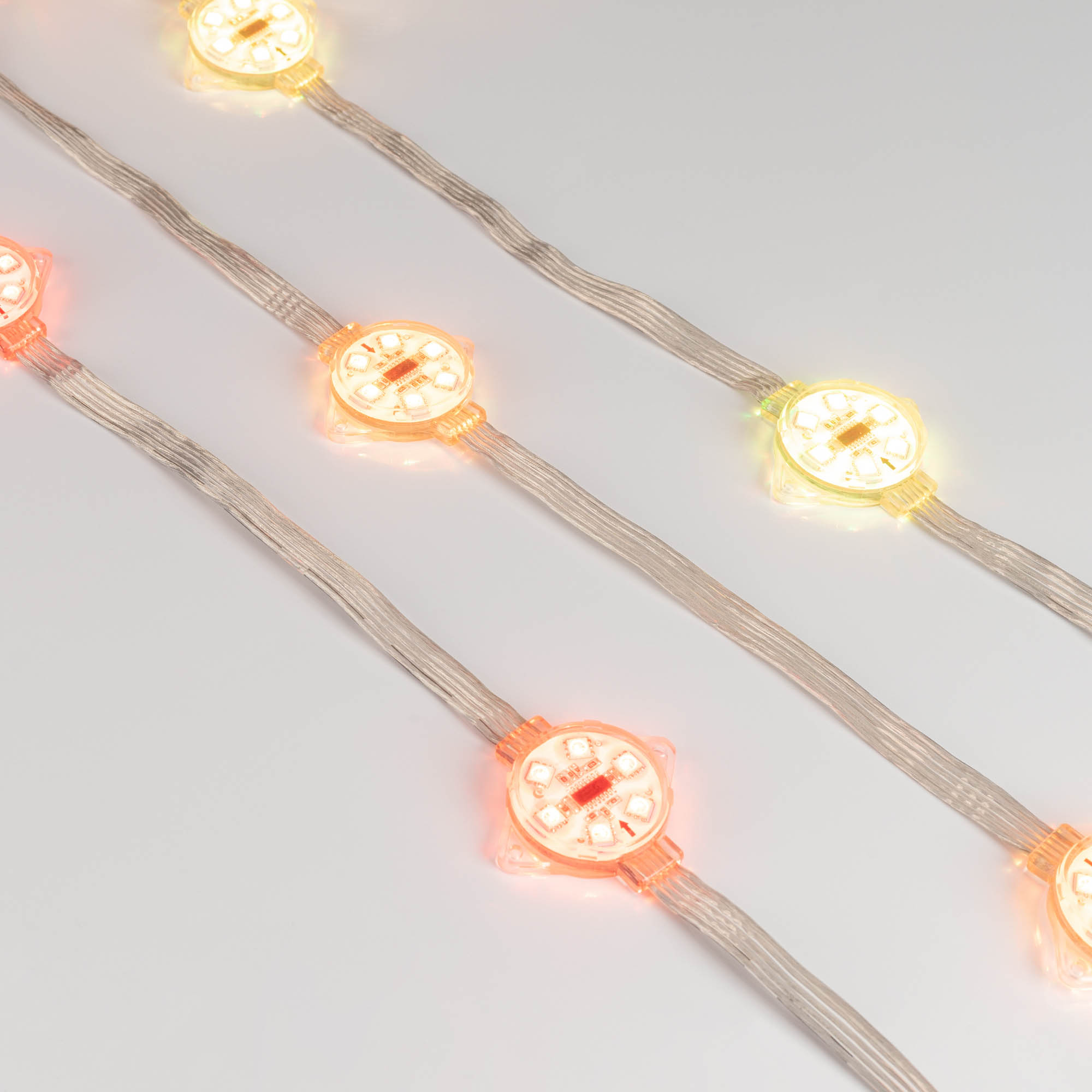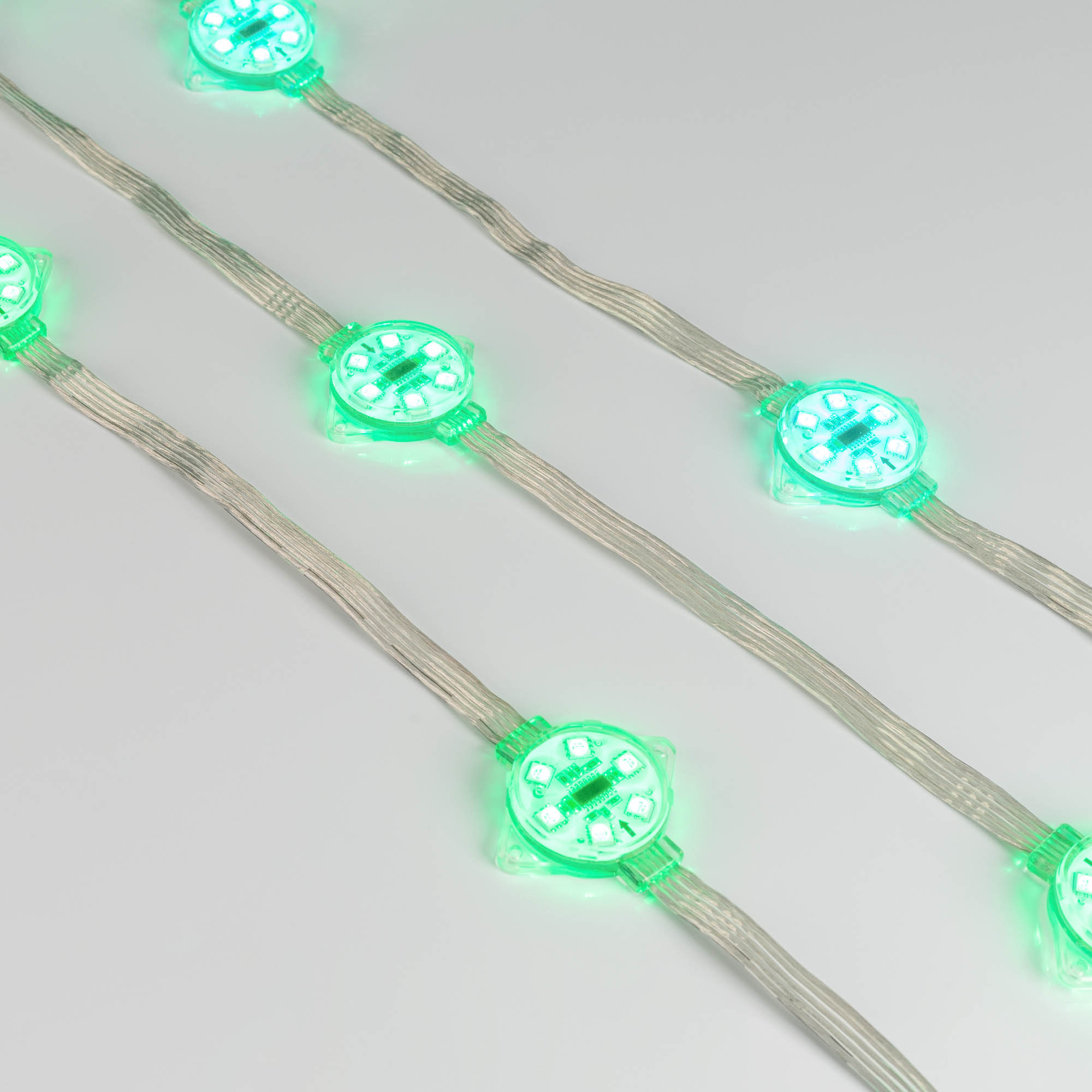 Управляемый светодиодный модуль DMX с держателем, RGB, микросхема TM512AС, напряжение 24 В, мощность 1.5 Вт, 6 светодиодов SMD 5060, угол 120°. Создание медиафасадов. 20 шт на цепочке, 2 цепочки в пакете, расстояние между центрами модулей 240 мм, длина провода между модулями 200 мм. IP68. Размер Ø40×12 мм. Гарантия 3 года. В комплекте инжектор питания.