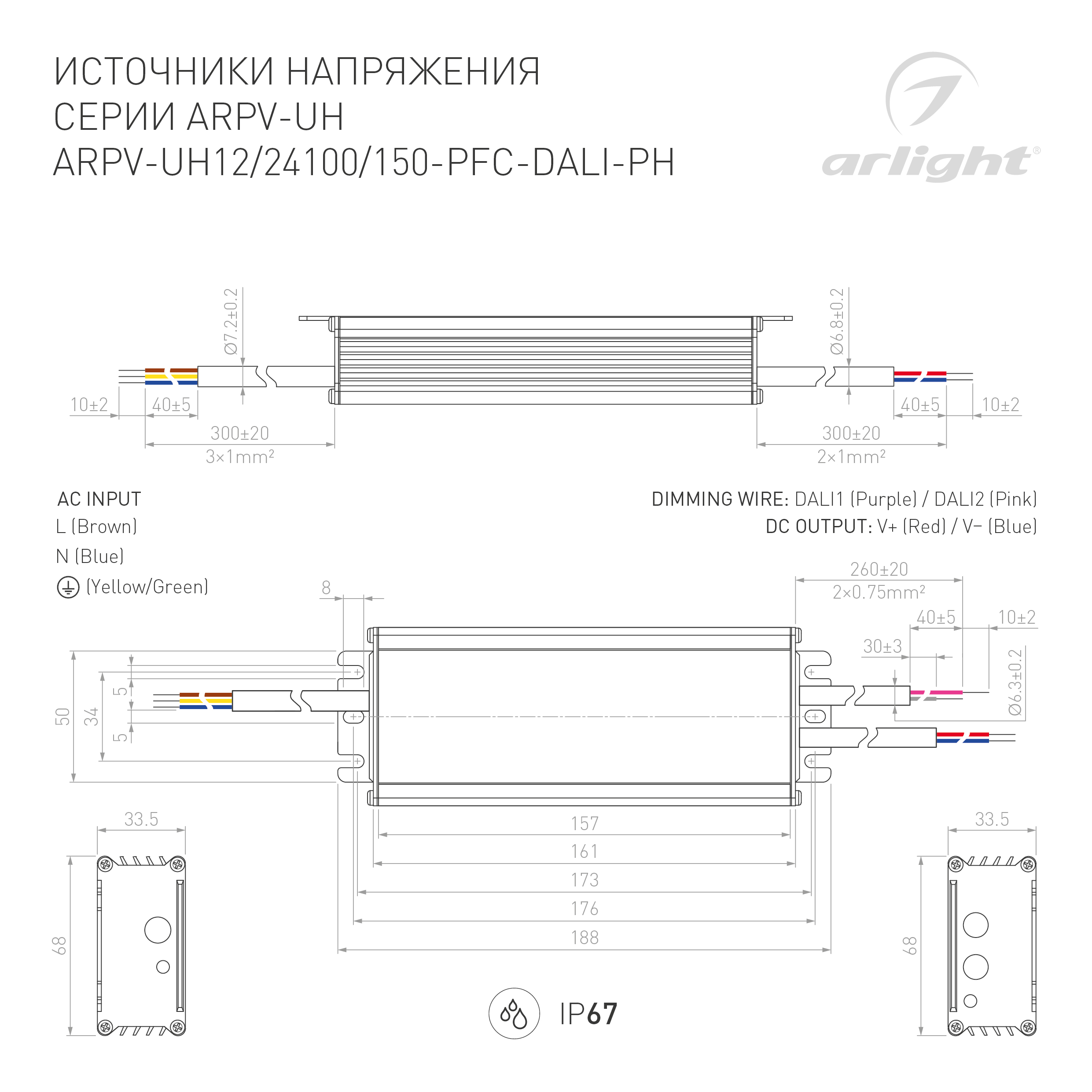 Диммируемый источник напряжения по протоколу DALI с гальванической развязкой для светодиодных изделий. Входное напряжение 120-240 VAC. Выходные параметры: 12 В, 8.3 А, 100 Вт. Встроенный PFC >0.95. Герметичный алюминиевый корпус IP 67. Рабочая температура -40…+70C⁰. Габаритные размеры длина 188 мм, ширина 67.5 мм, высота 33.5 мм. Гарантийный срок 7 лет.