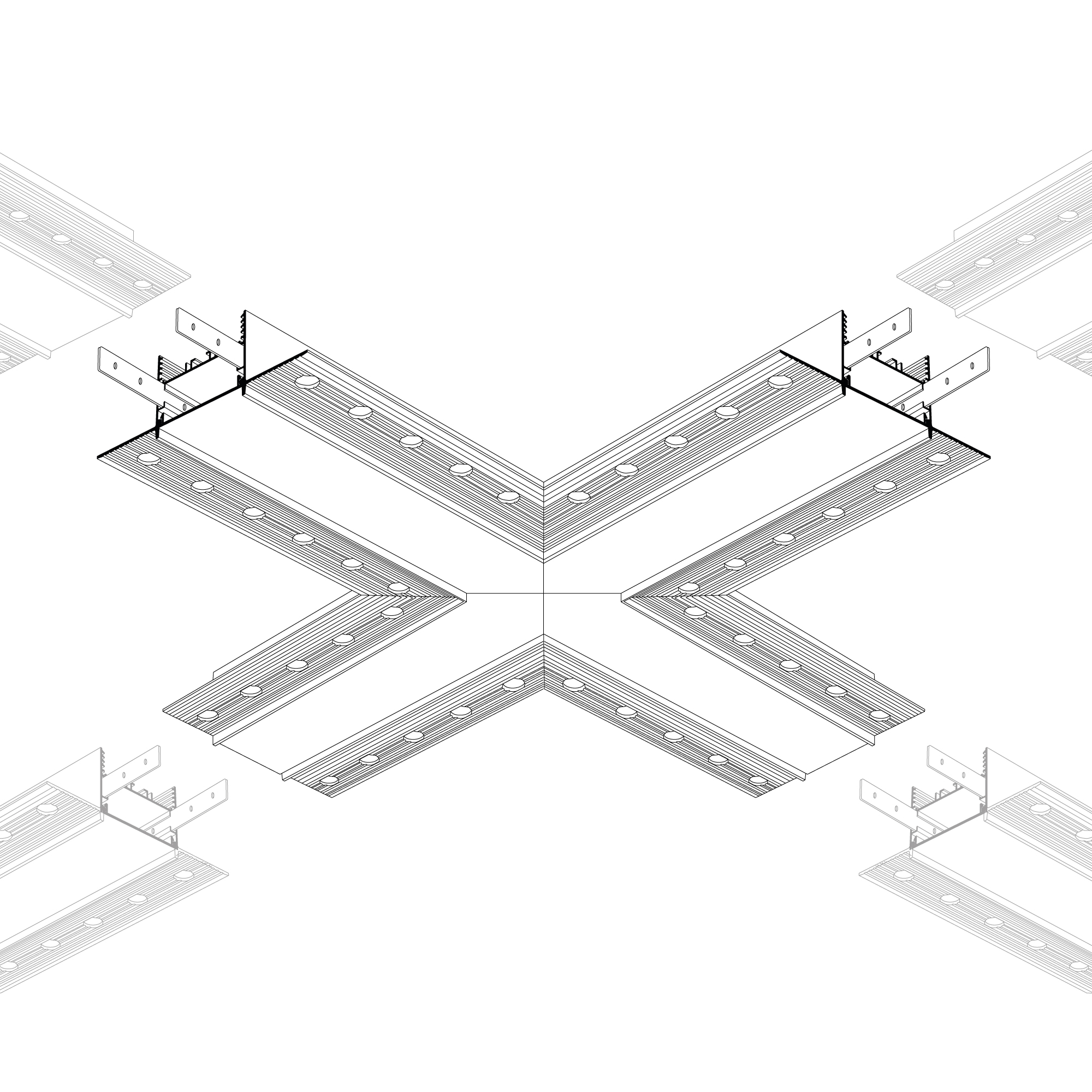 Крестовой угол в сборе для соединения четырех профилей SL-LINIA45-FANTOM под прямыми углами 90° в одной плоскости в комплекте с матовым экраном, соединителями и винтами. Экран образует Х-образную фигуру на плоскости. Применятся при изготовлении светильников сложной геометрии. Длина крестовины 401 мм. Цена за комплект.