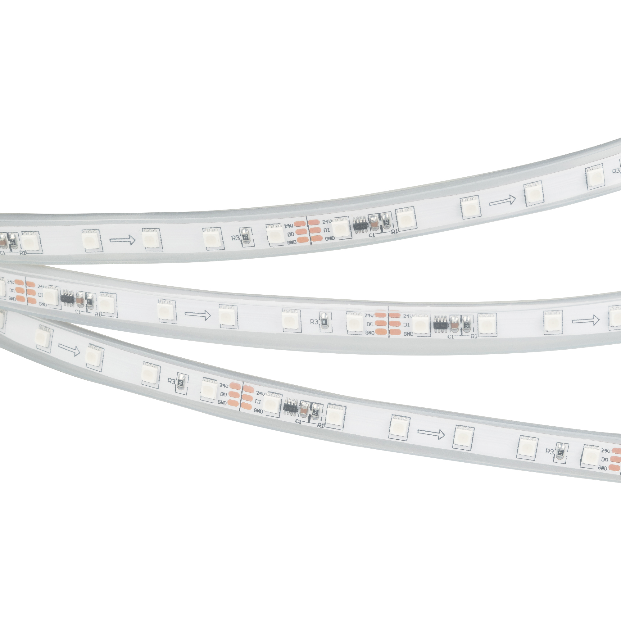 Герметичная лента SPI «Бегущий огонь» с микросхемой 16703(MT1803), IP66. Управление через внешний контроллер (совместимый c микросхемами TM1812, UCS1903, GS8206, WS2812–2815) по стандартному протоколу SPI. Используется для воспроизведения многоцветных световых эффектов различной сложности: от простейших эффектов до воспроизведения динамических изображений на мультимедийных экранах. Применяется для создания рекламных вывесок, оформление витрин, помещений для дискотек, ресторанов, театрализованных шоу.