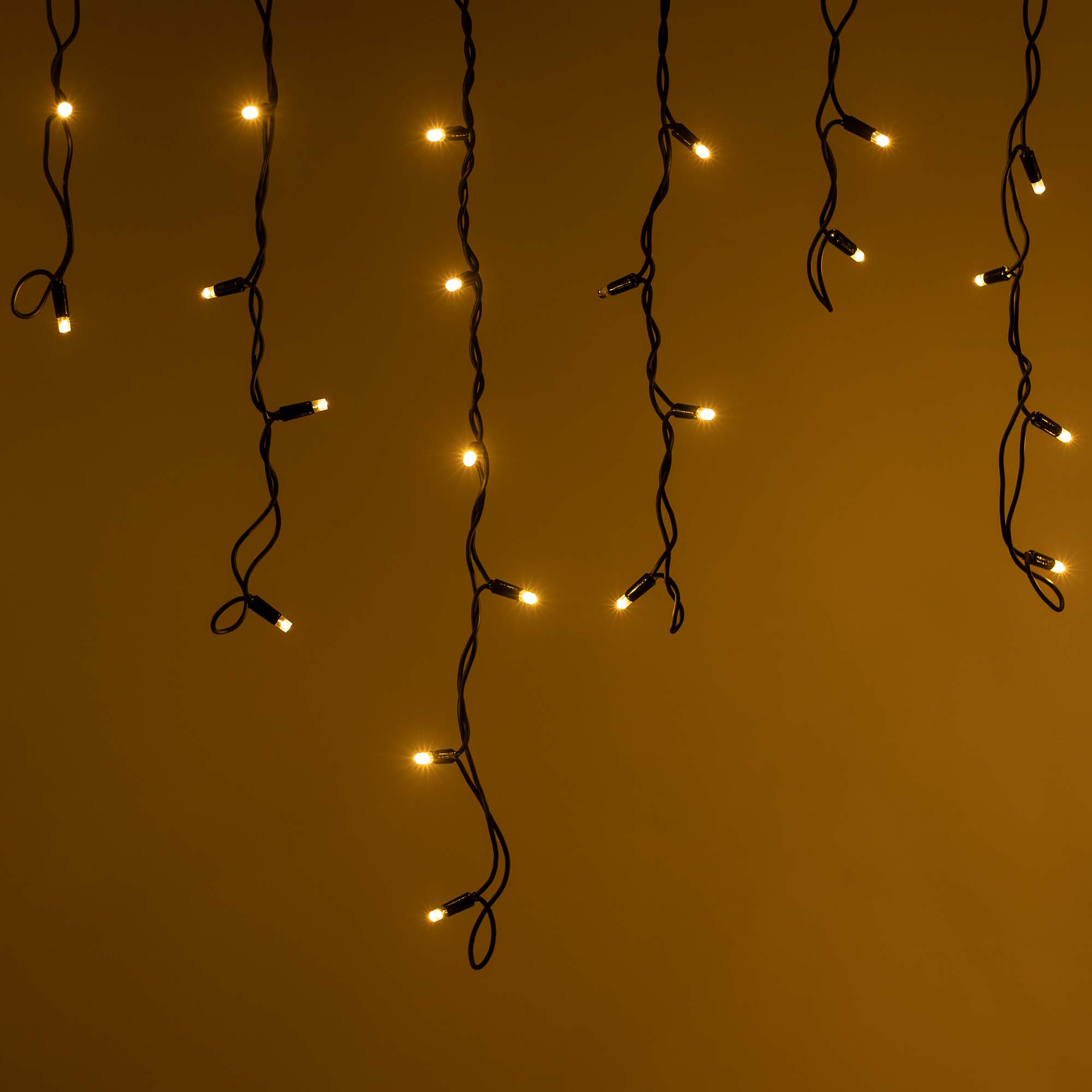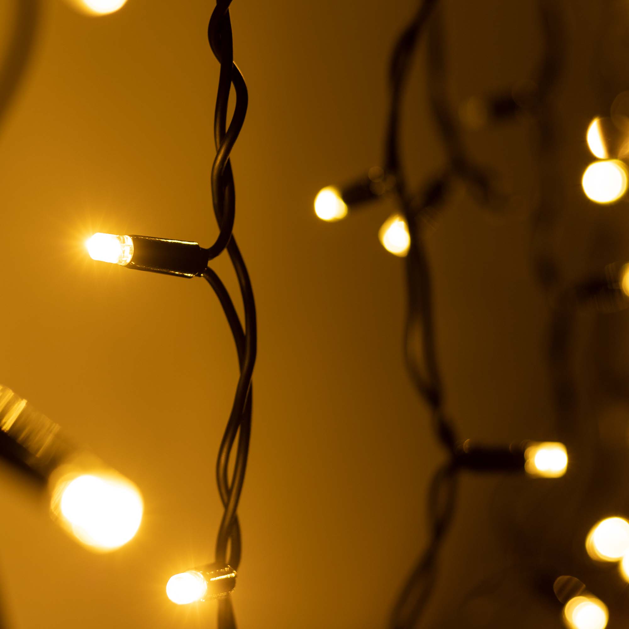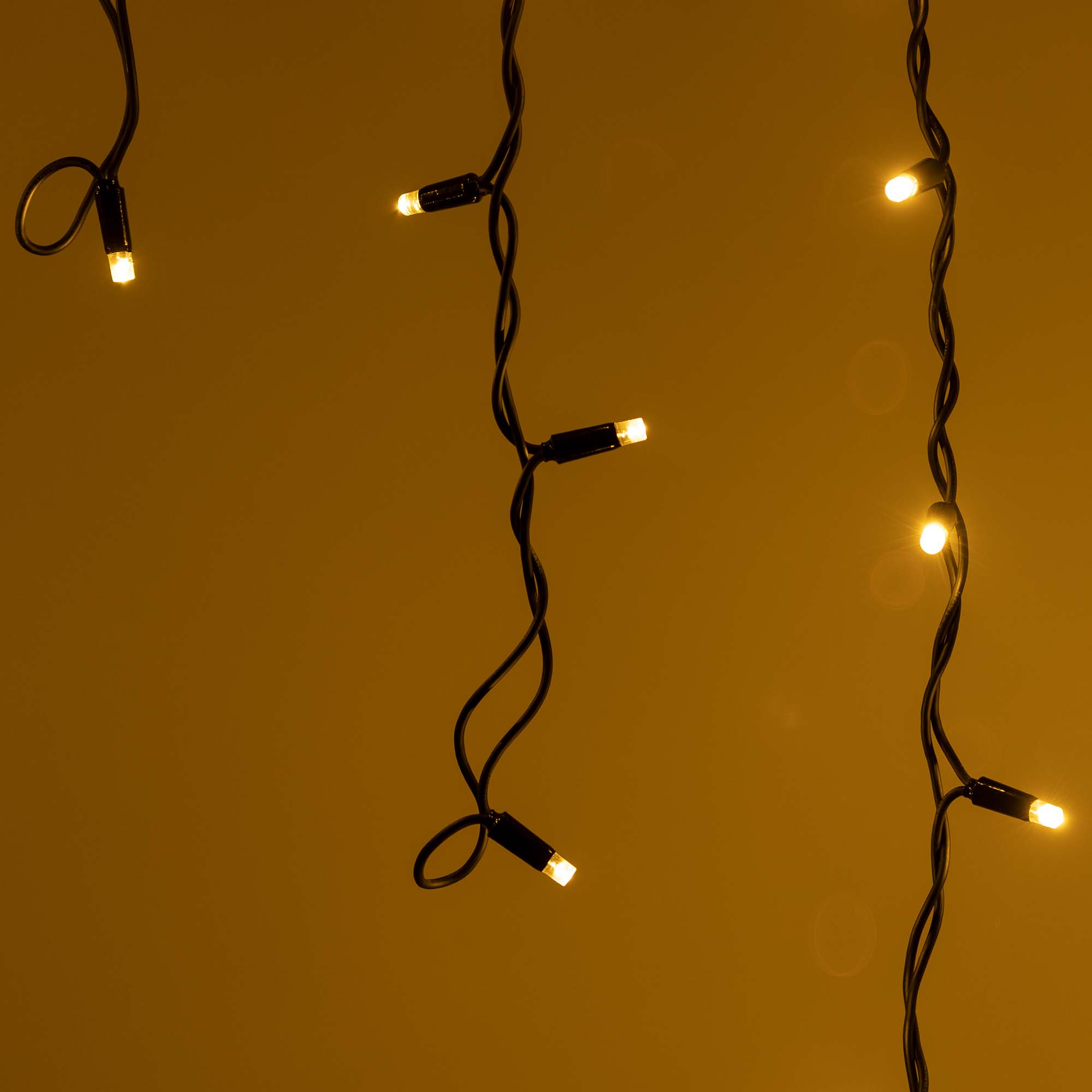 Светодиодная бахрома Pro. Размер 4000 мм (длина 4000 мм, по длине 32 нити высотой 200/600 мм). Количество светодиодов 128 шт размером 7 мм. Основной цвет свечения ТЕПЛЫЙ БЕЛЫЙ (3000 К), эффект мерцания редких точек ТЕПЛЫЙ БЕЛЫЙ (3000К) с резким световым рисунком (прозрачная вогнутая линза), соотношение светодиодов: 106 теплых постоянного свечения / 22 белых с мерцанием. Эффект частого мерцания. Провод черный, каучук. Питание 230 В, Мощность 6 Вт, защита IP65, применение на улице под навесом. Аксессуары для подключения приобретаются отдельно.