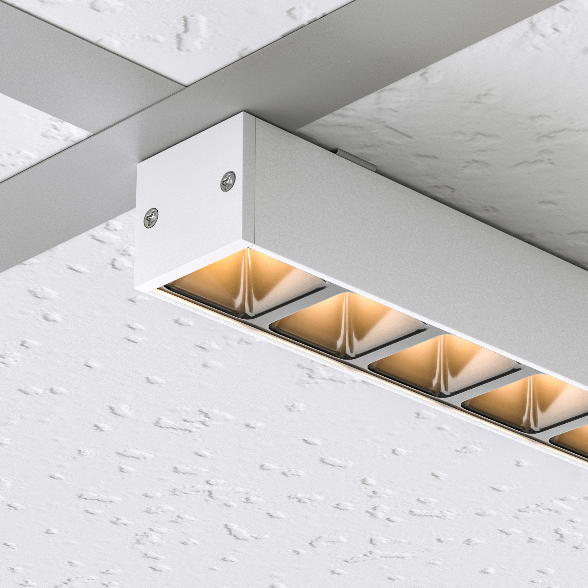 Линейный светодиодный светильник SNAP-STARLINE-LASER-S1200-26W Warm3000 (WH-BK, 80 deg, 48V) для направляющих потолка «Армстронг» шириной 15 и 24 мм это удобное и эффективное решение освещения. Поворотное крепление светильника фиксируется на направляющей и совместимо с профилем разной ширины. Лаконичный корпус прямоугольного сечения из алюминия идеально подходит и для накладного монтажа с помощью держателя 034271. Мощность светильника 28 Вт, световой поток 2060 лм, световая эффективность 74 лм/Вт, цвет свечения теплый белый (3000 K). Узкий угол 80 градусов позволяет использовать светильник для акцентного освещения. Из светильников можно составлять линейные или геометрические фигуры на потолке, что позволяет воплотить любые идеи светового дизайна. Светильник с напряжением питания 48 В и степенью защиты IP40 подходит для создания комфортного освещения в офисах, магазинах, жилых и коммерческих помещениях. Драйвер для подключения поставляется отдельно.