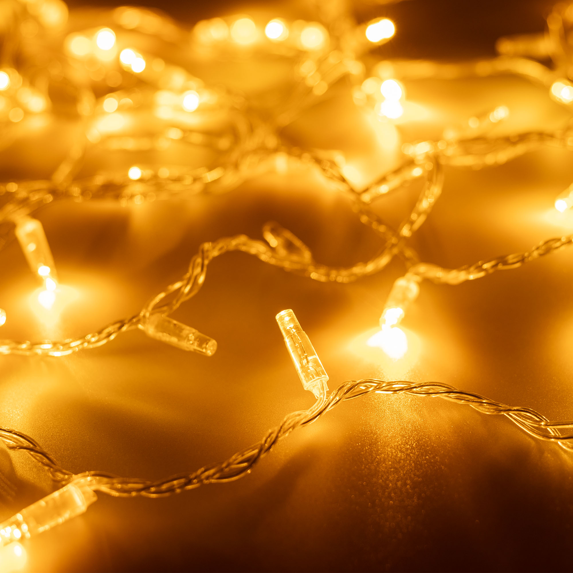 Светодиодная нить Classic. Размер 10000 мм. Цвет свечения ЖЕЛТЫЙ. 100 светодиодов размером 7 мм с эффектом медленного мерцания каждого светодиода с резким световым рисунком (прозрачная вогнутая линза). Провод прозрачный, ПВХ. Питание 230 В, Мощность 7 Вт, защита IP65, применение в помещении и на улице под навесом. Аксессуары для подключения и управления приобретаются отдельно.