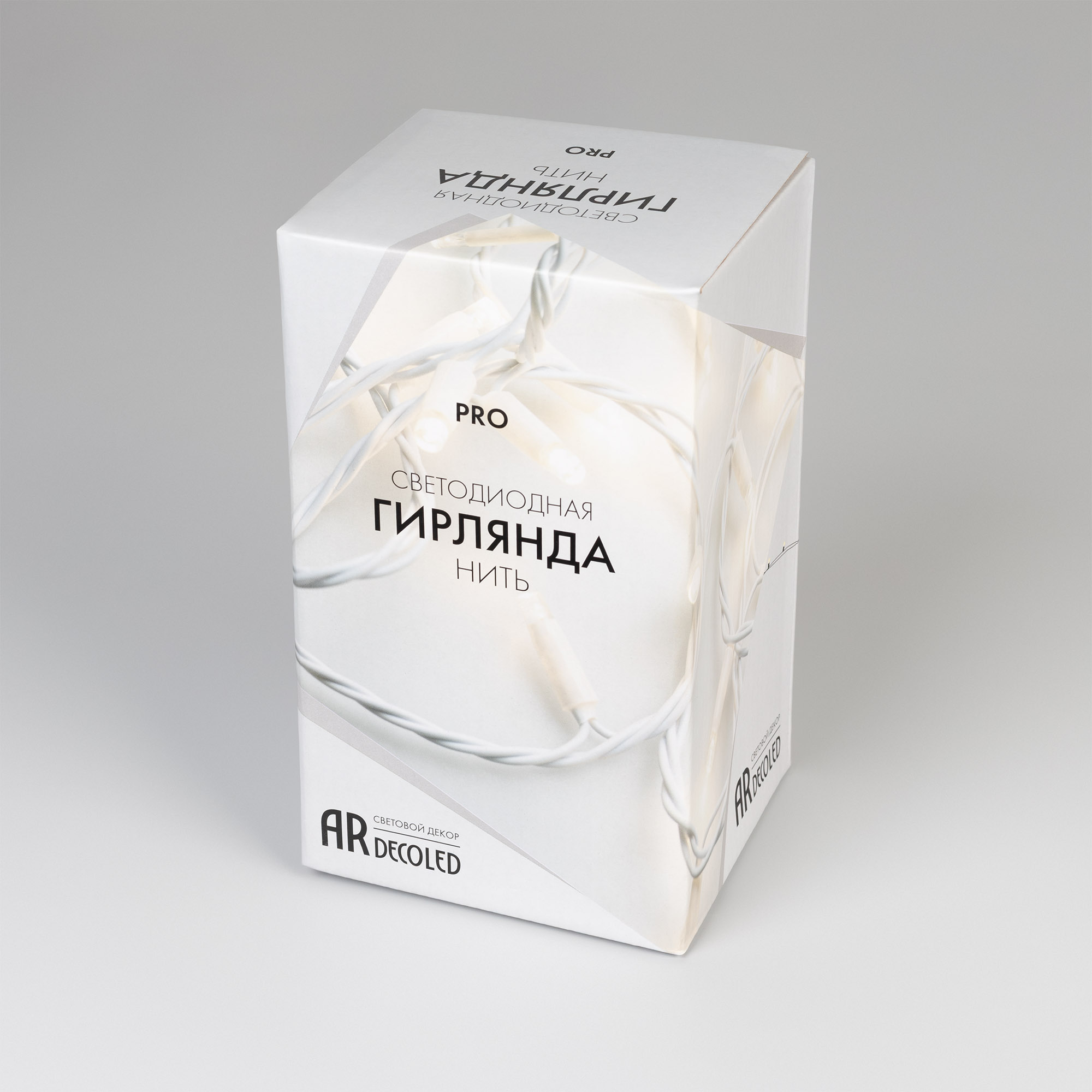 Универсальная светодиодная гирлянда "НИТЬ" серии Pro, предназначенная для декорирования и создания праздничного настроения как внутри помещений, так и снаружи (степень пылевлагозащиты IP65 позволяет размещать гирлянду на улице под навесом). Имея длину 10000 мм, она может использоваться для оформления средних и больших площадей. Универсальные соединительные разъемы позволяют наращивать длину до 50 м без использования дополнительных аксессуаров. Прозрачная вогнутая линза и эффект медленного мерцания каждого светодиода обеспечивают яркое, динамичное освещение, выделяя украшаемые объекты. Тёплый белый свет помогает создать необходимую атмосферу для декоративного объекта. Провод изготовлен из каучука и окрашен в темно-зеленый цвет. Аксессуары для подключения и управления приобретаются отдельно.