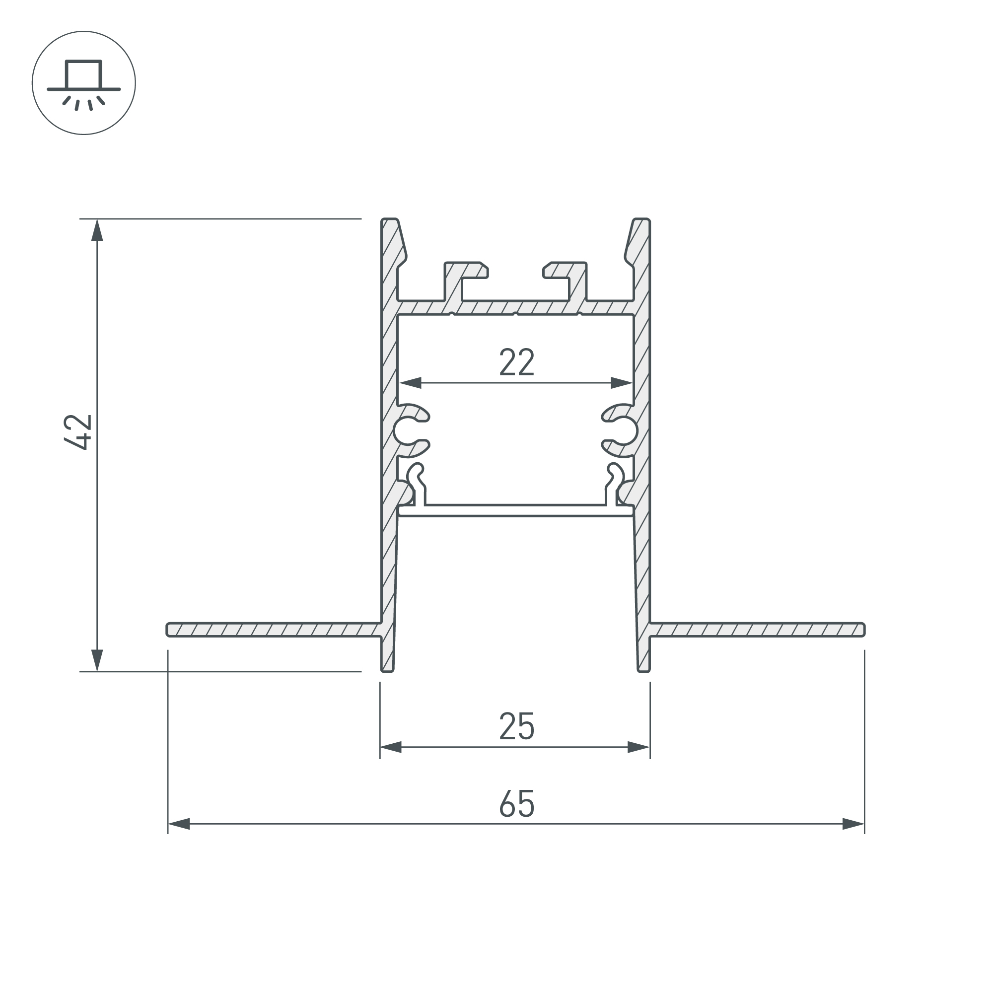 Алюминиевый анодированный профиль для светодиодных лент и линеек. Скрытая установка (под строительную отделку). Экран утоплен в плоскости профиля, что позволяет скрыть источник света от прямого контакта с глазами. Габаритные размеры (L×W×H): 2000x65x42 мм, паз для установки 25 мм. Ширина площадки для ленты 22 мм. Экраны, заглушки и другие аксессуары приобретаются отдельно. Цена за 1 метр.