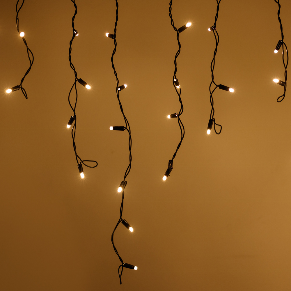 Светодиодная бахрома Classic. Размер 2400x600 мм (длина 2400 мм, по длине 24 нити высотой 200/600 мм). Количество светодиодов 88 шт размером 7 мм. Цвет свечения ТЕПЛЫЙ БЕЛЫЙ (3000 К), эффект постоянного свечения с мягким световым рисунком (выпуклая молочно-белая линза). Провод черный, ПВХ. Питание 230 В, Мощность 6 Вт, защита IP65, применение на улице под навесом. Аксессуары для подключения приобретаются отдельно.