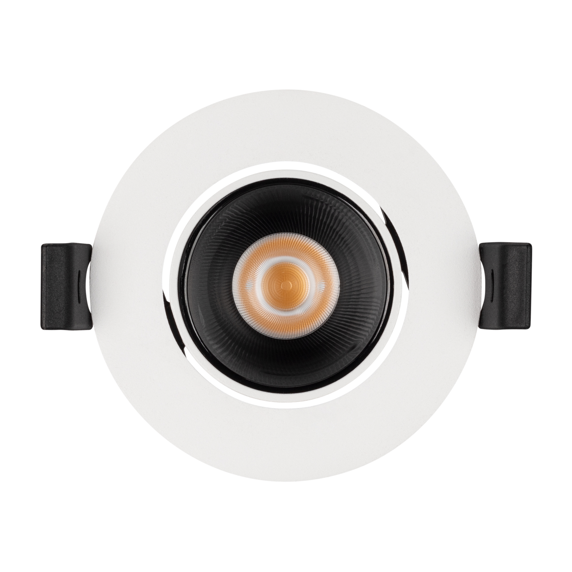 Встраиваемый поворотный светильник даунлайт. Мощность 8.4 Вт, св. поток 682 лм, 79 лм/Вт, теплый 3000 K, CRI>90, UGR<16, угол 32°, напряжение питания 230 В. Белый круглый корпус из алюминия, черный МАТОВЫЙ отражатель из PMMA, степень защиты IP20. Размер: диаметр 82 мм, высота 51 мм. Монтаж встраиваемый, установочное отверстие: диаметр 75 мм. Драйвер 21-42 В, 200 мА, пульсация <2%.