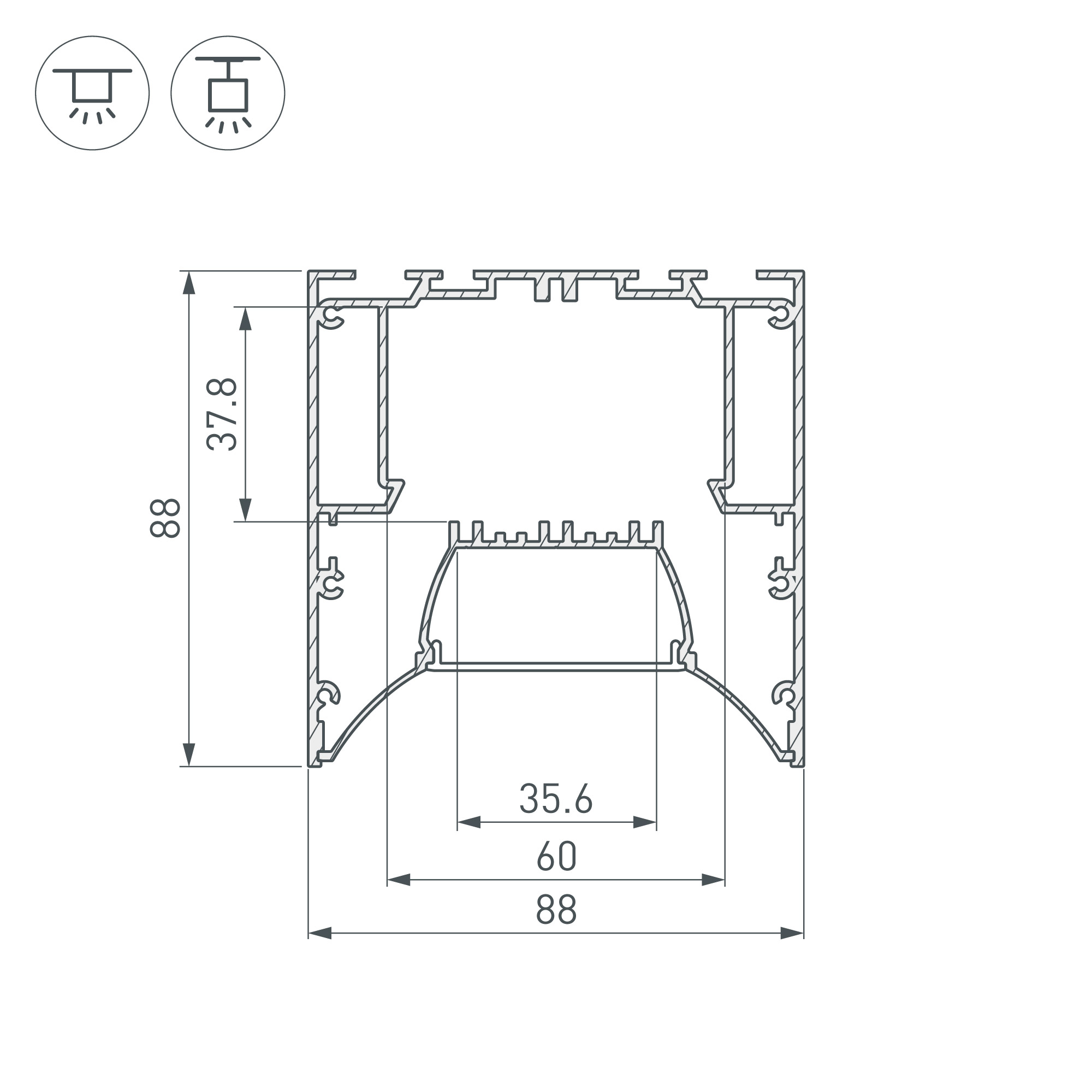 Накладной/подвесной профиль из анодированного алюминия с утопленным экраном для основного освещения и контурной подсветки. Отсек для блока питания (48х38 мм) и съемная площадка для светодиодной ленты значительно облегчают сервисное обслуживание осветительного оборудования. Габаритные размеры профиля составляют 2000 мм в длину, 88 мм в ширину и 88 мм в высоту. Площадка для установки светодиодных лент позволяет использовать ленту шириной до 35,6 мм и мощностью до 57 Вт/м. Это обеспечивает гибкость в выборе светодиодных лент и создает потрясающие световые решения. Экран, заглушки и другие аксессуары (в том числе фиксаторы для соединения профиля с площадкой для ленты) не включены в комплект и приобретаются отдельно. Цена указана за 1 метр профиля. Отличное решение для создания современных световых проектов.