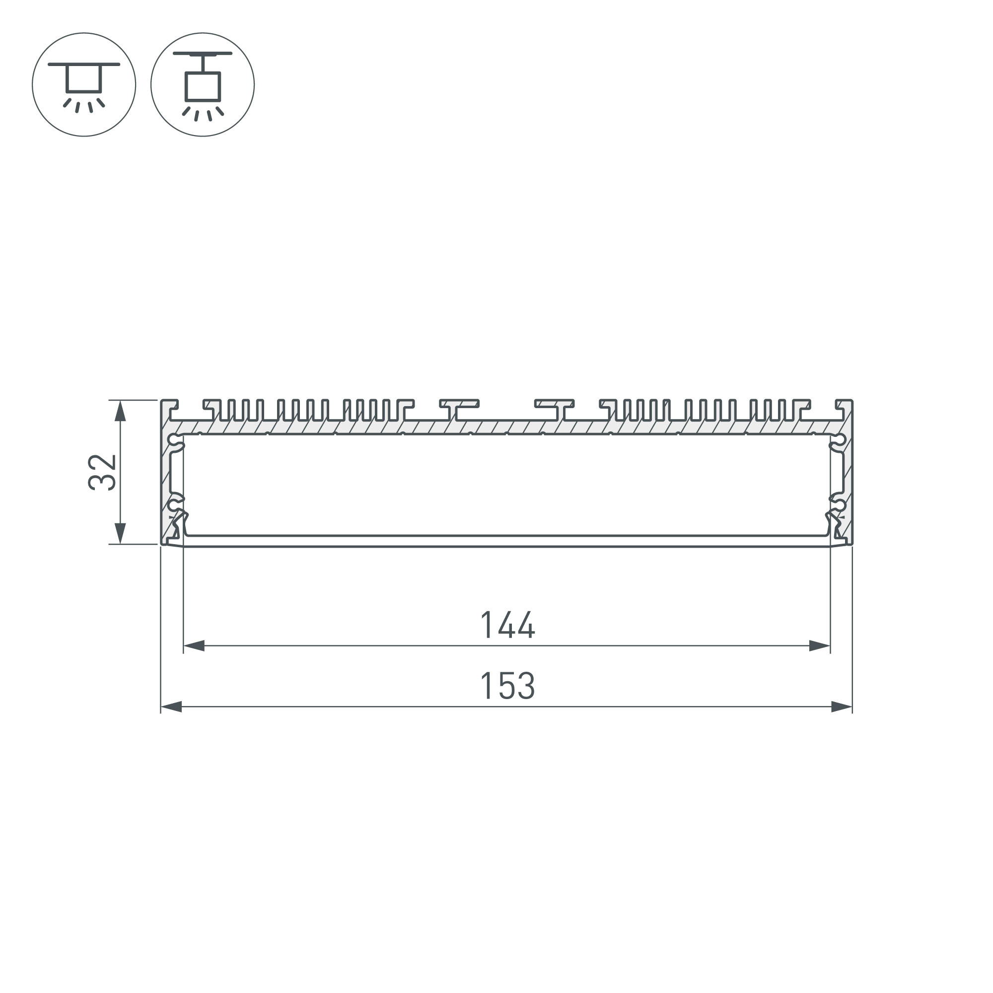 Алюминиевый анодированный профиль для светодиодных лент и линеек. Габаритные размеры (L×W×H): 2000x153x32 мм. Ширина площадки для ленты 144 мм. Экраны, заглушки и другие аксессуары приобретаются отдельно. Цена за 1 метр.