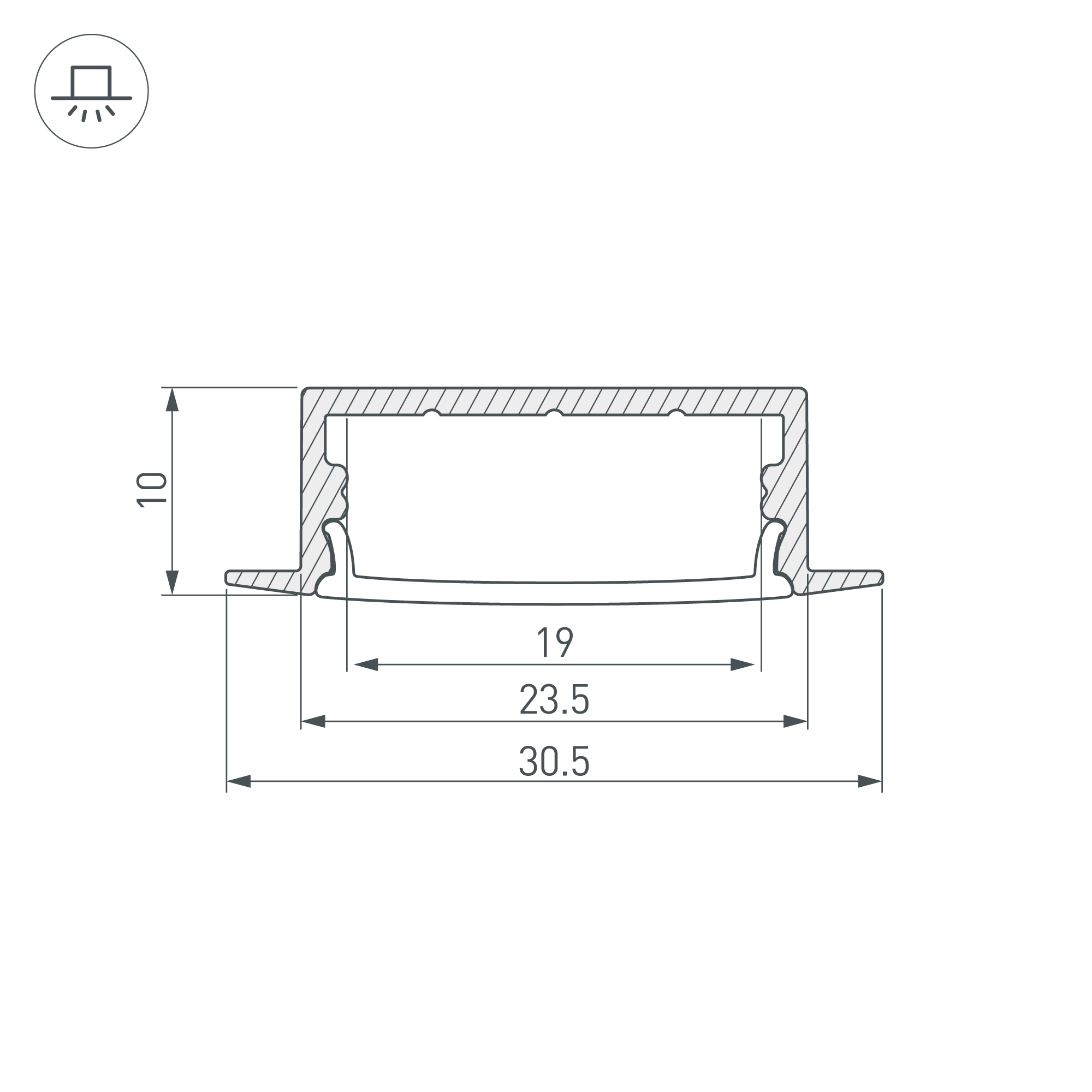Комплект с матовым экраном (016585) и заглушками (2 шт), в индивидуальной упаковке. Алюминиевый анодированный встраиваемый профиль для светодиодных лент и линеек. Габаритные размеры (L×W×H): 2000x30,5x10 мм. Паз для установки 23,5мм. Ширина площадки для ленты 19 мм. Цена за комплект: профиль - 2 м, экран - 2 м, заглушки - 2 шт. (одна - глухая, другая - с отверстием), держатели - 2 шт.