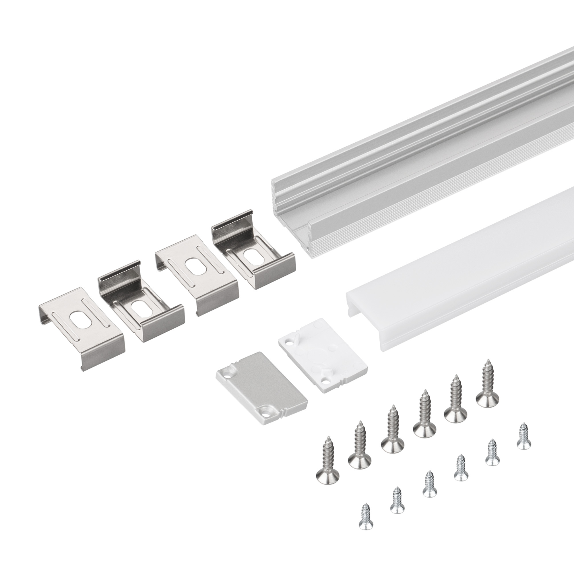 Накладной профиль из анодированного алюминия в комплекте с матовым экраном со светопропусканием 57%, заглушками и держателями для декоративного освещения интерьера. Габаритные размеры профиля составляют 2000 мм в длину, 20 мм в ширину и 13 мм в высоту. Площадка для установки светодиодных лент позволяет использовать ленту шириной до 15 мм и мощностью до 17 Вт/м. Это обеспечивает гибкость в выборе светодиодных лент и создает потрясающие световые решения.